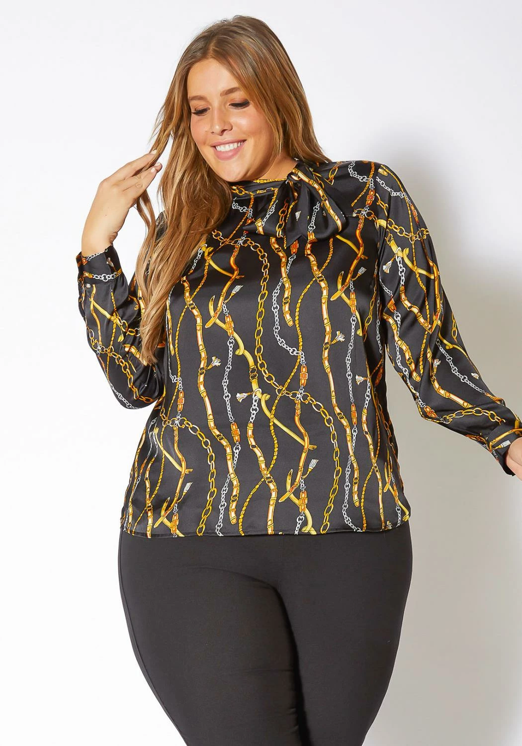 Plus size women’s satin golden chain printed blouse with scarf tie neck closure.