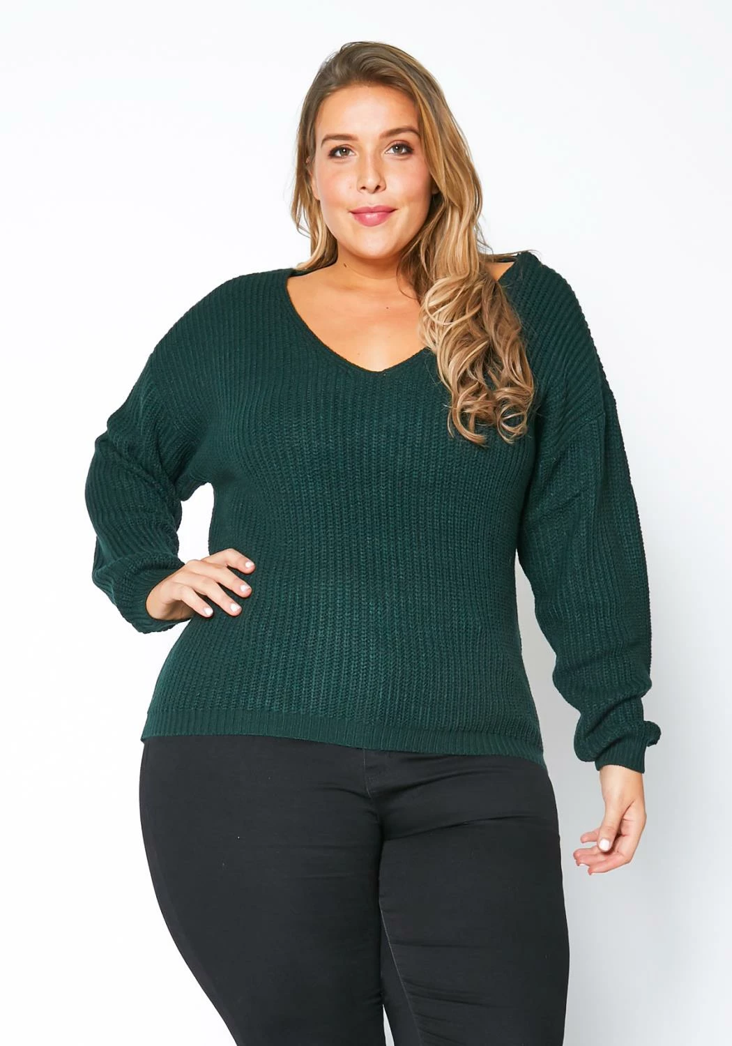 Plus size women’s casual everyday sweater with V-Neck front and lace up criss cross open back.