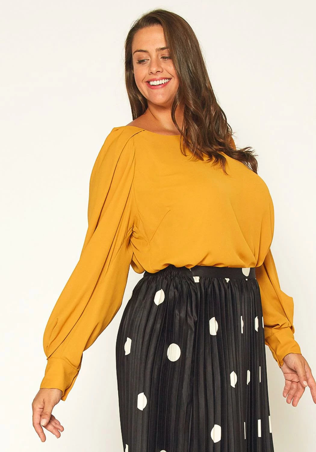 Plus size omen’s everyday blouse with gathered puffy sleeve accent.