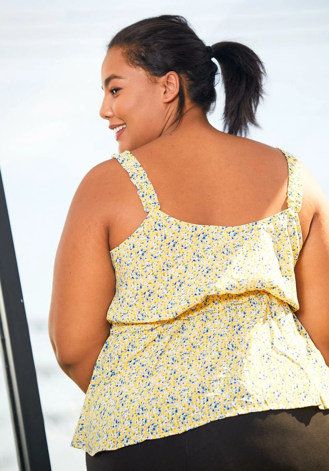 Pleione’s sweet floral women blouse with ruffled trim detail across the waist and shoulder straps. Great daily top that can easily be styled up with your favorite accessories!
