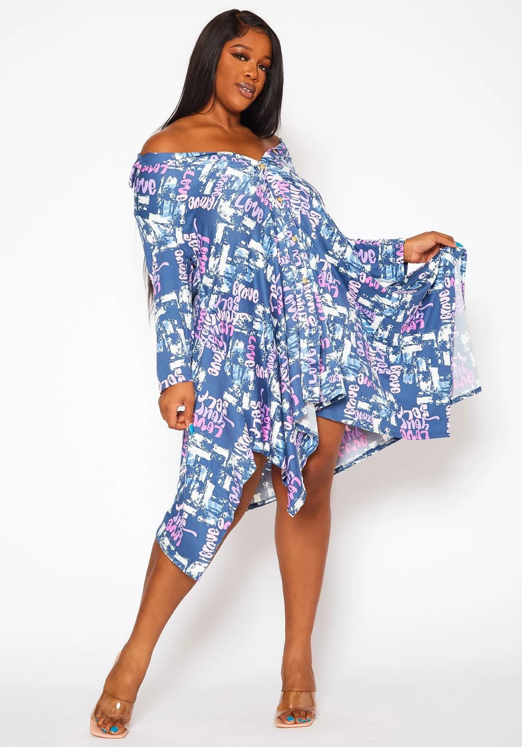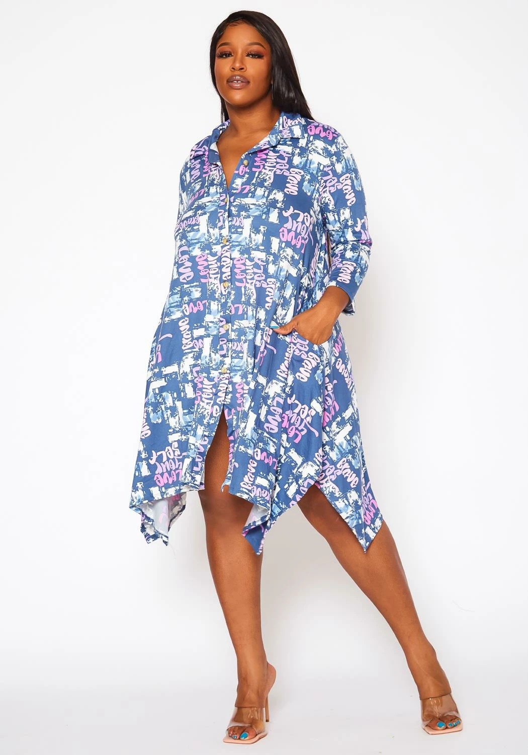 Unique plus size women’s mini dress in multi graphic pattern, button front closure, collar neck style and half sleeves.
