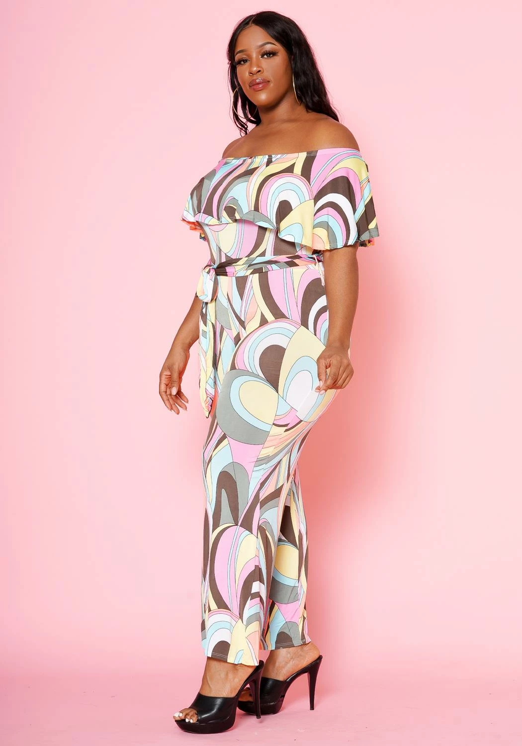 Unique plus size women’s jumpsuit that makes a stylish impression. Features pastel abstract pattern, off shoulder style with overlay hem and waist tie ascent.