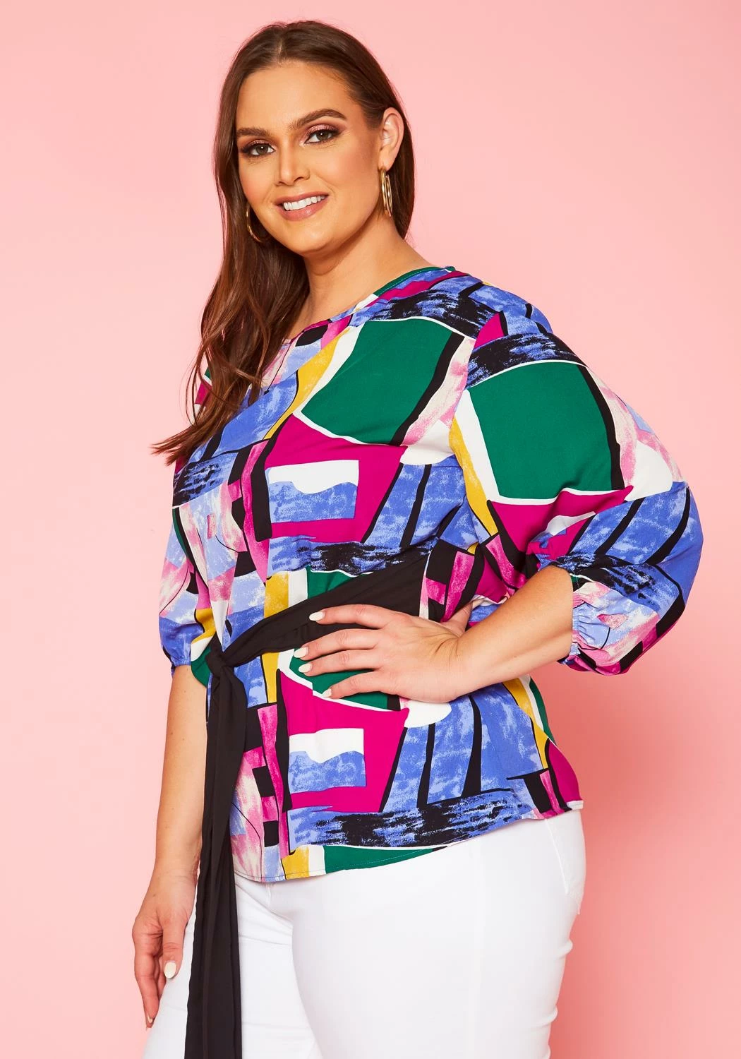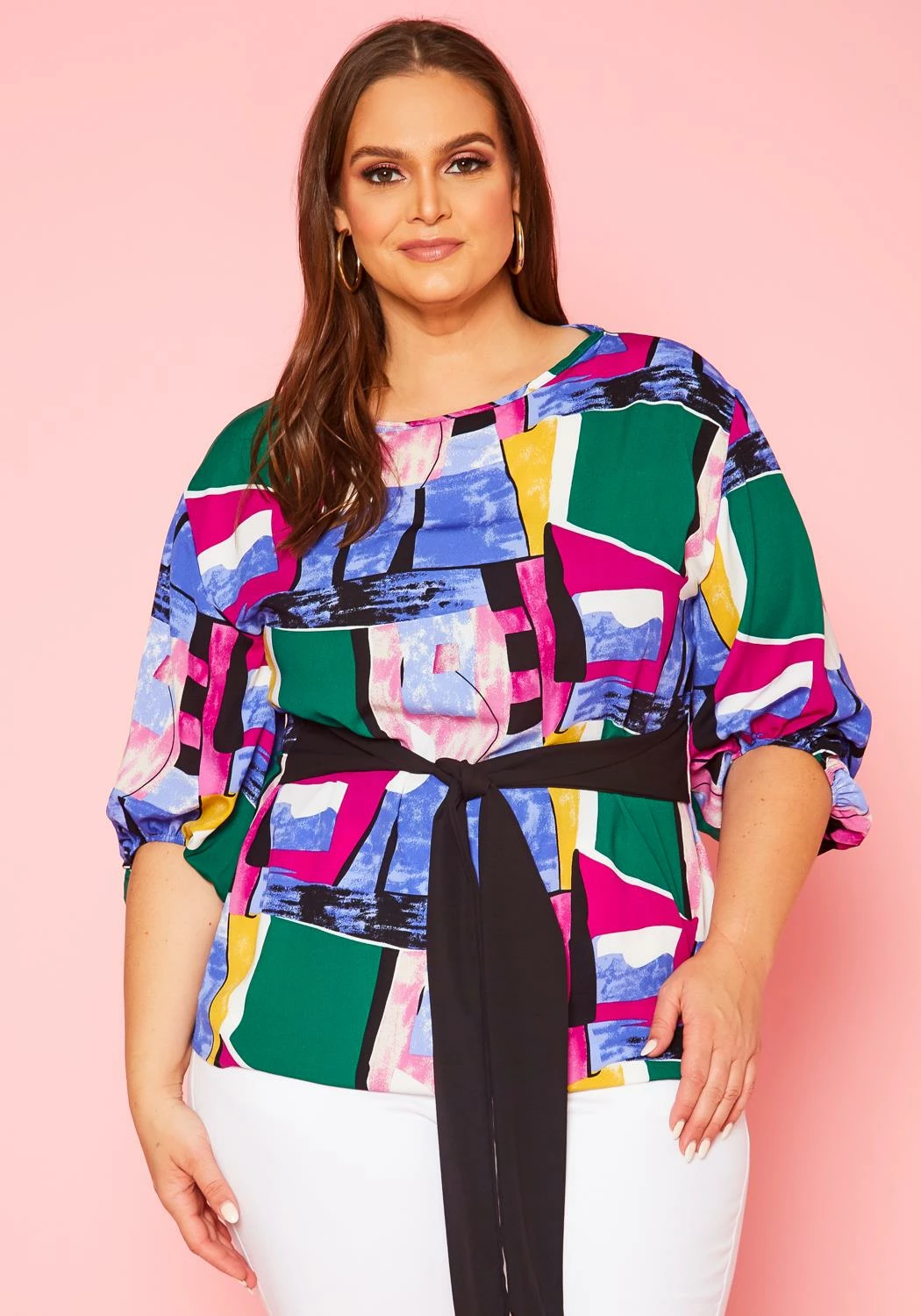 Lovely blouse in abstract colorful pattern for plus size women. Features half puff sleeves, round neckline and a waist tie ascent.