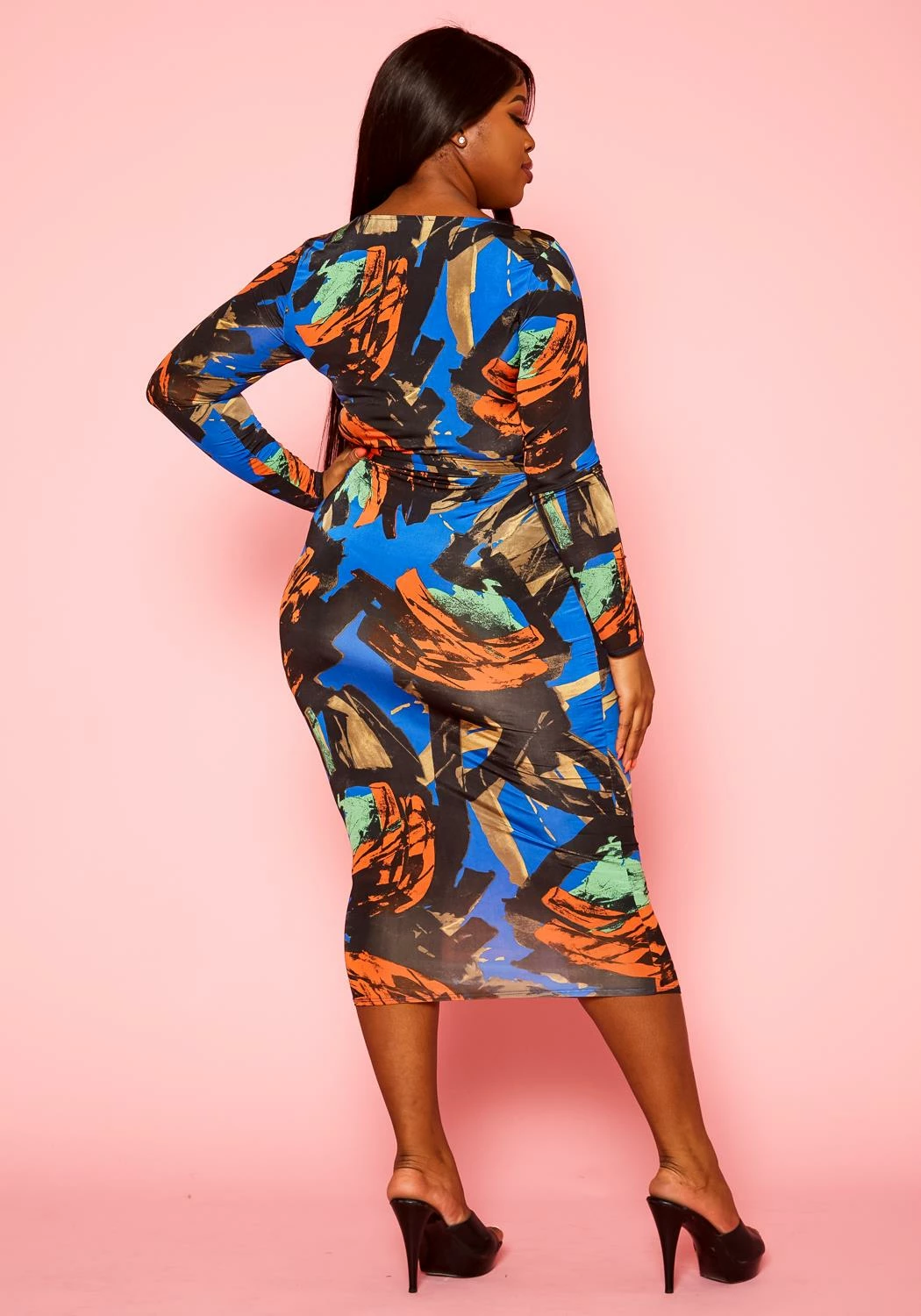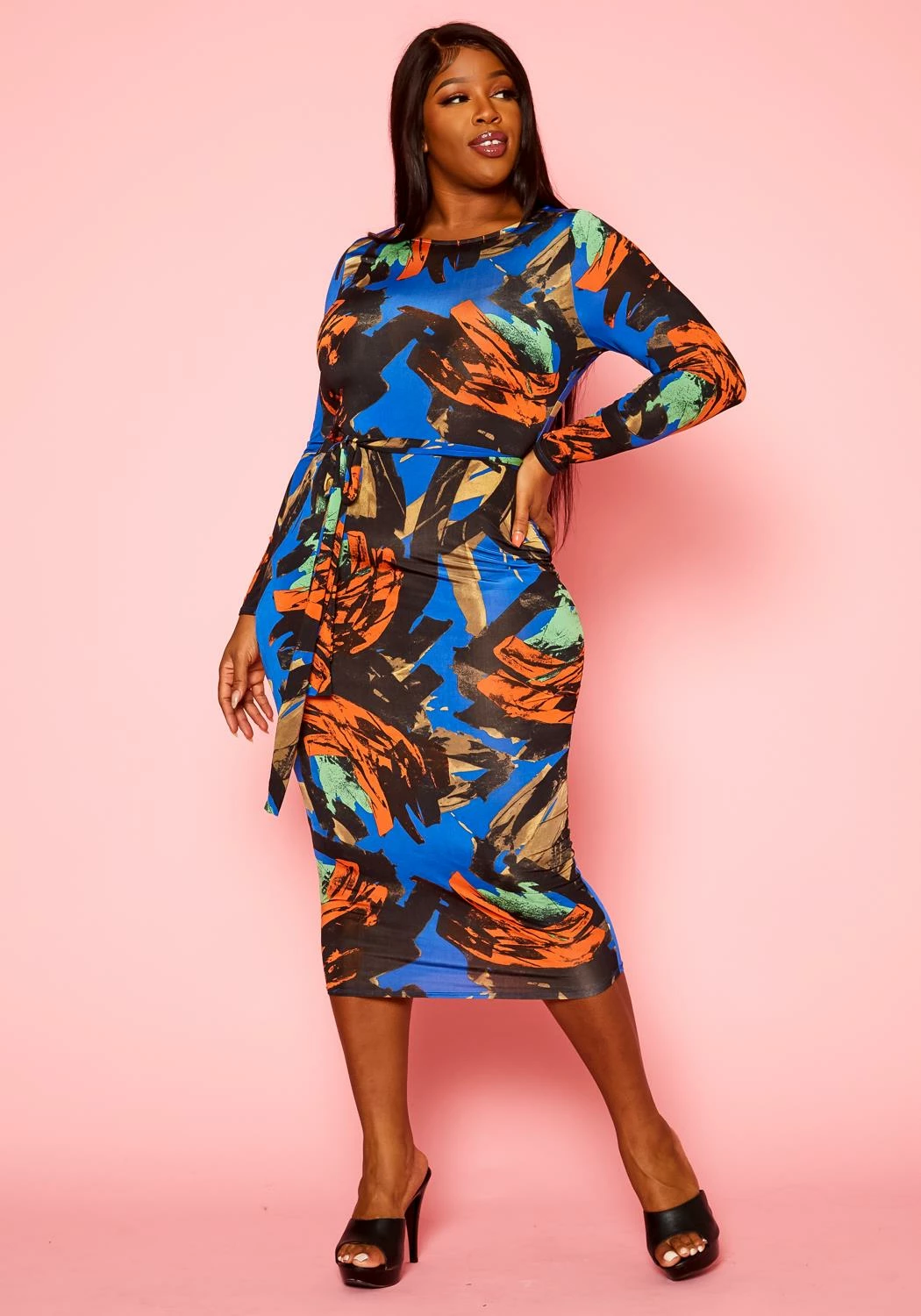 Stunning plus size women’s midi dress in bodycon fitting, abstract multi color print, fitted long sleeves and waist tie ascent.