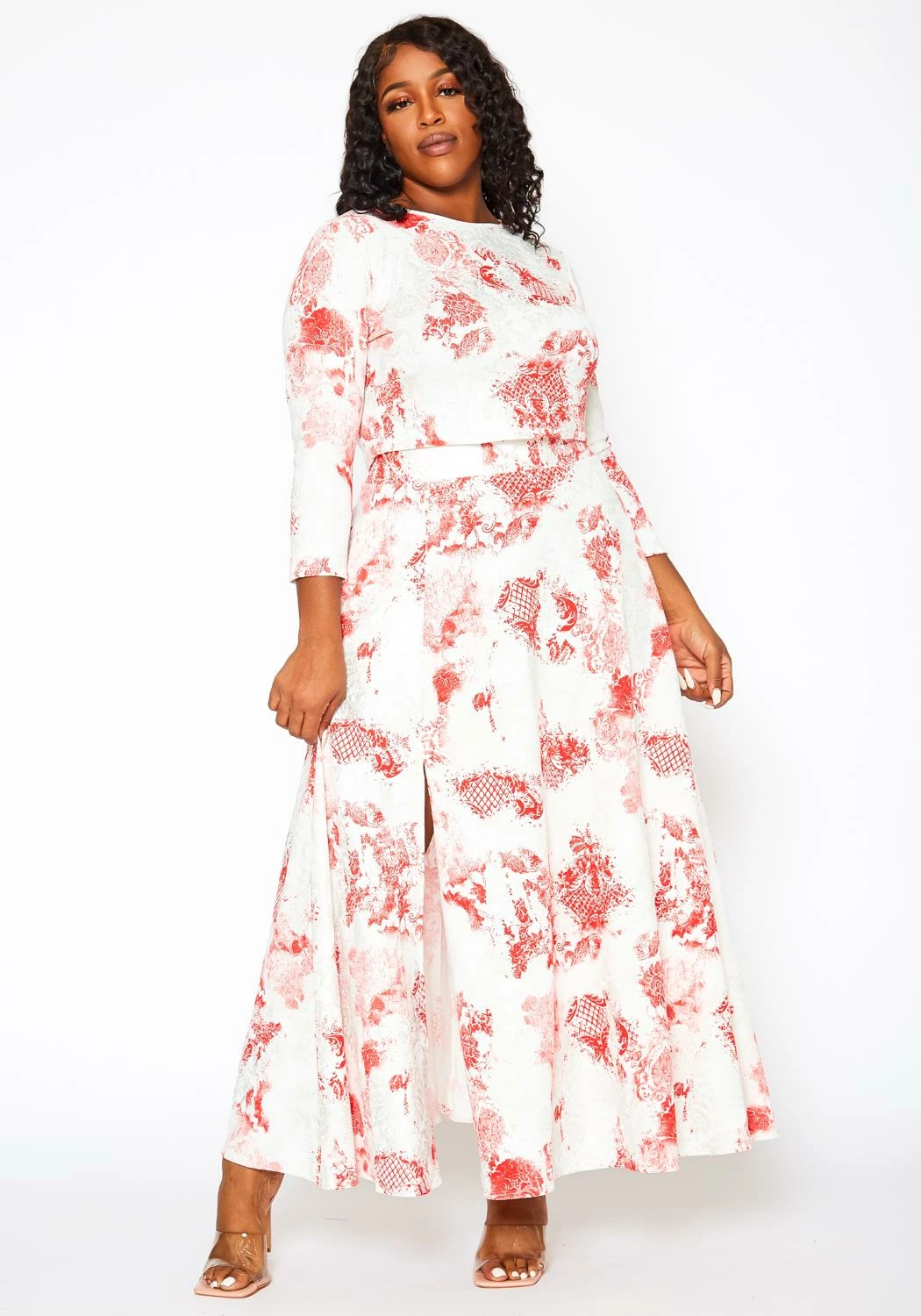 Gorgeous plus size women’s antique floral print matching set which features a 3/4 cropped long sleeve top and high rise slit hem maxi skirt.
