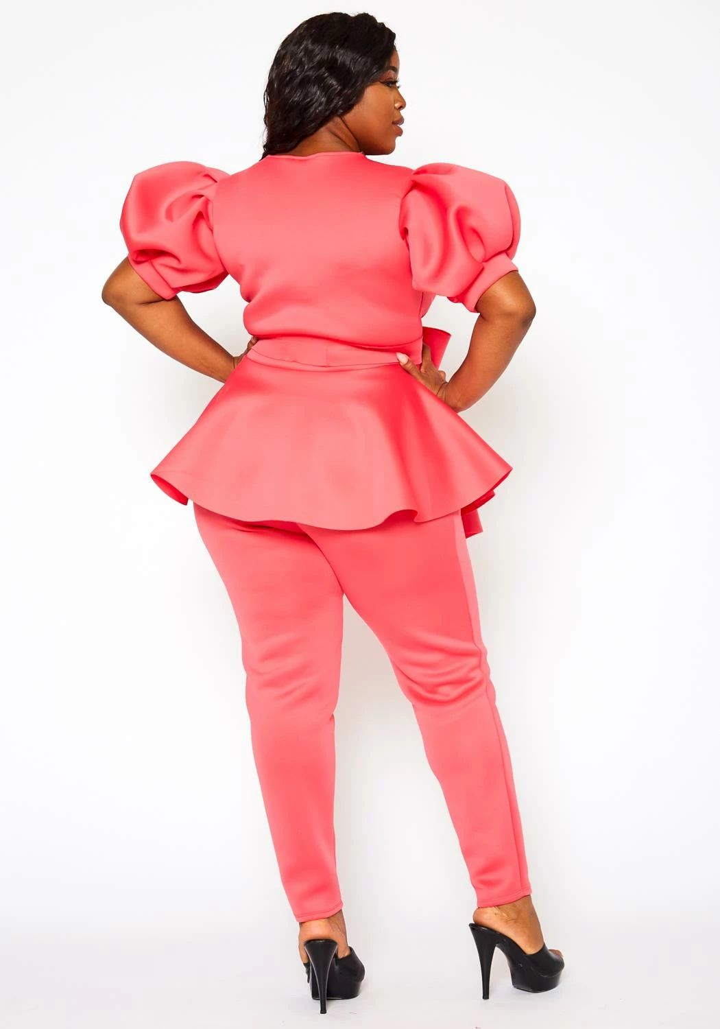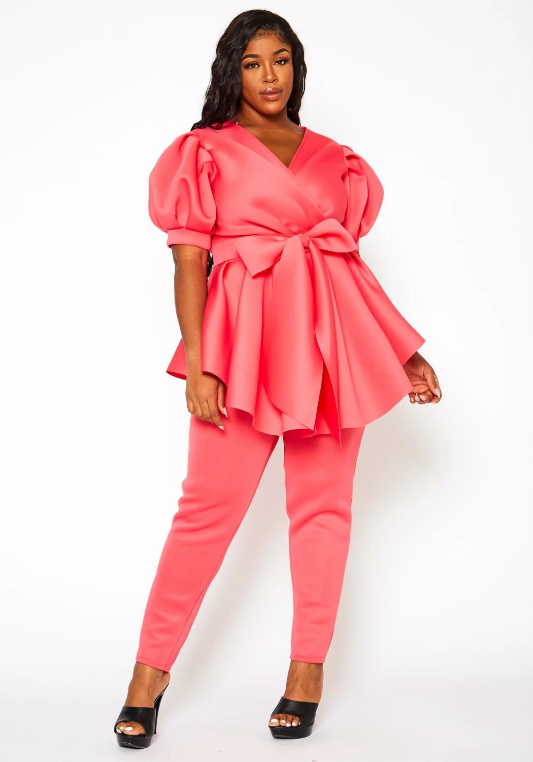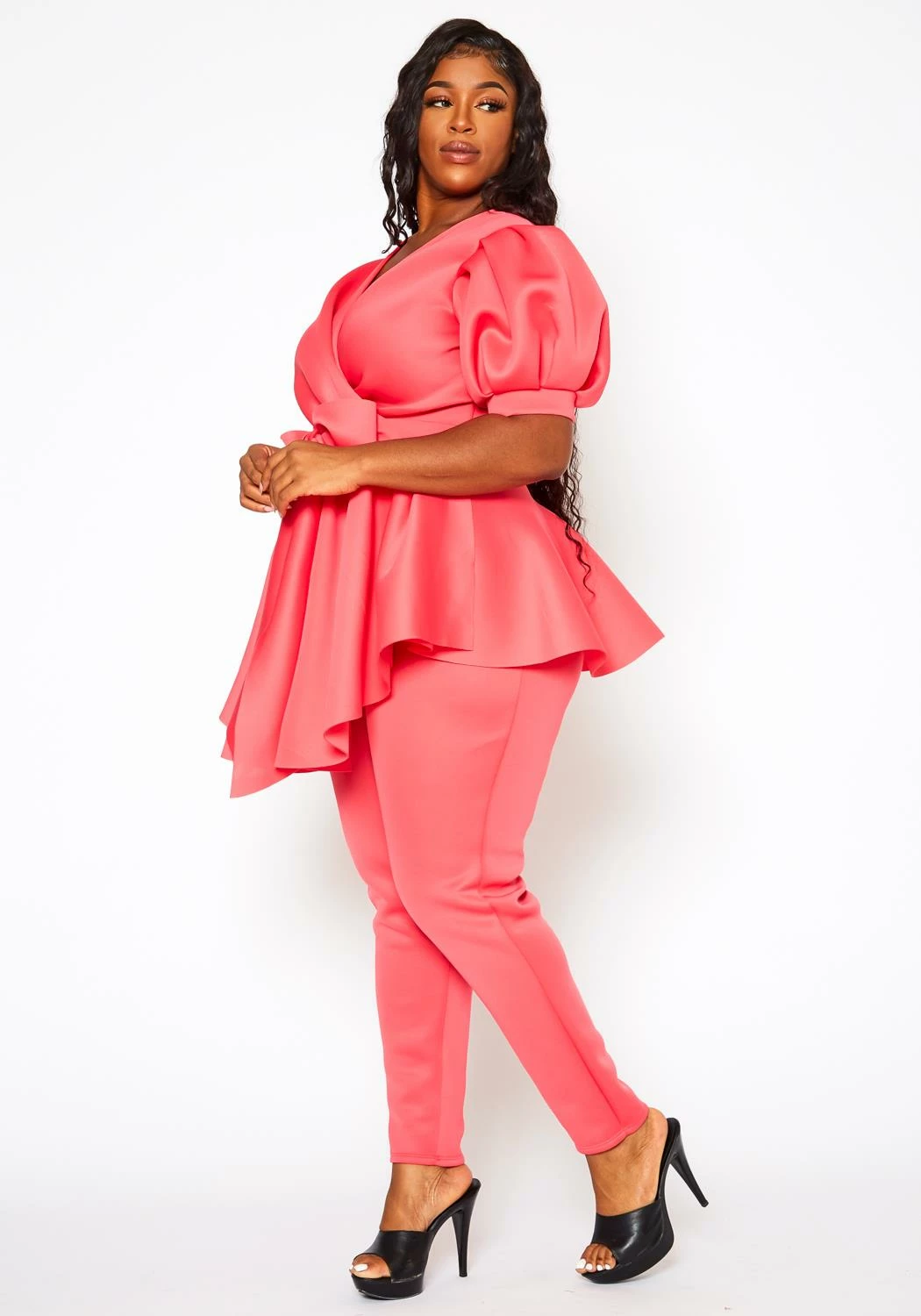 Lavish plus size women’s matching set which features a asymmetric flare peplum top with puffy short sleeve, v-neck style, bow tie hem and high waist pants.