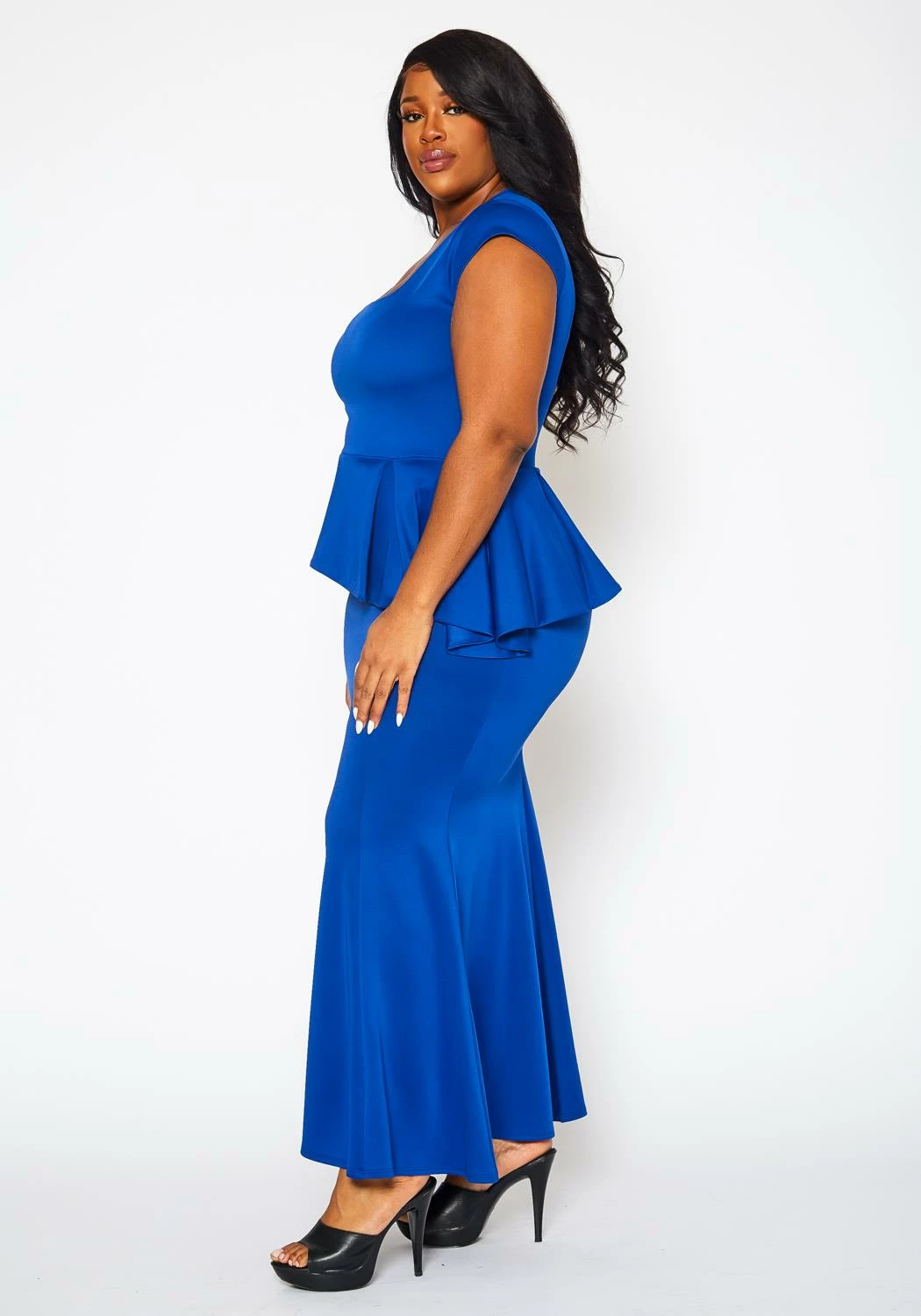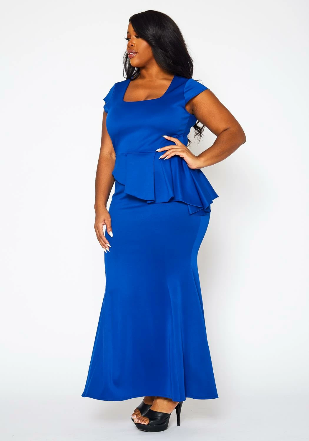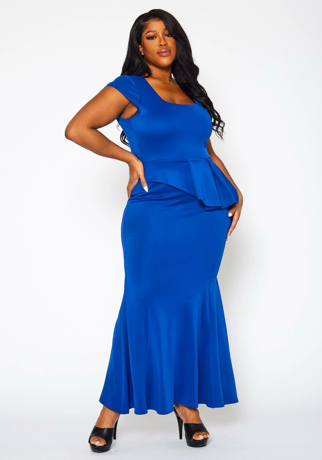 Alluring plus size women’s gown featuring an elegant mermaid hem, asymmetric peplum flare, square neck style, short sleeves and back zipper closure.