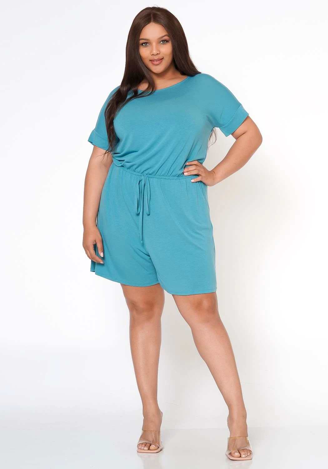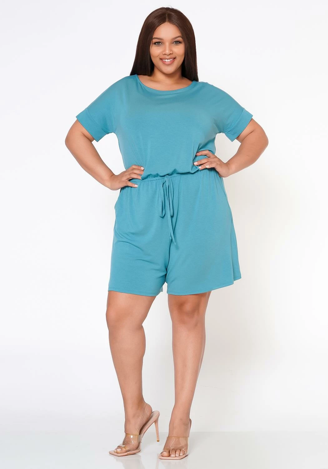 Casual plus size women’s lounge romper in solid color, short sleeves, round neck style and elastic waistline.