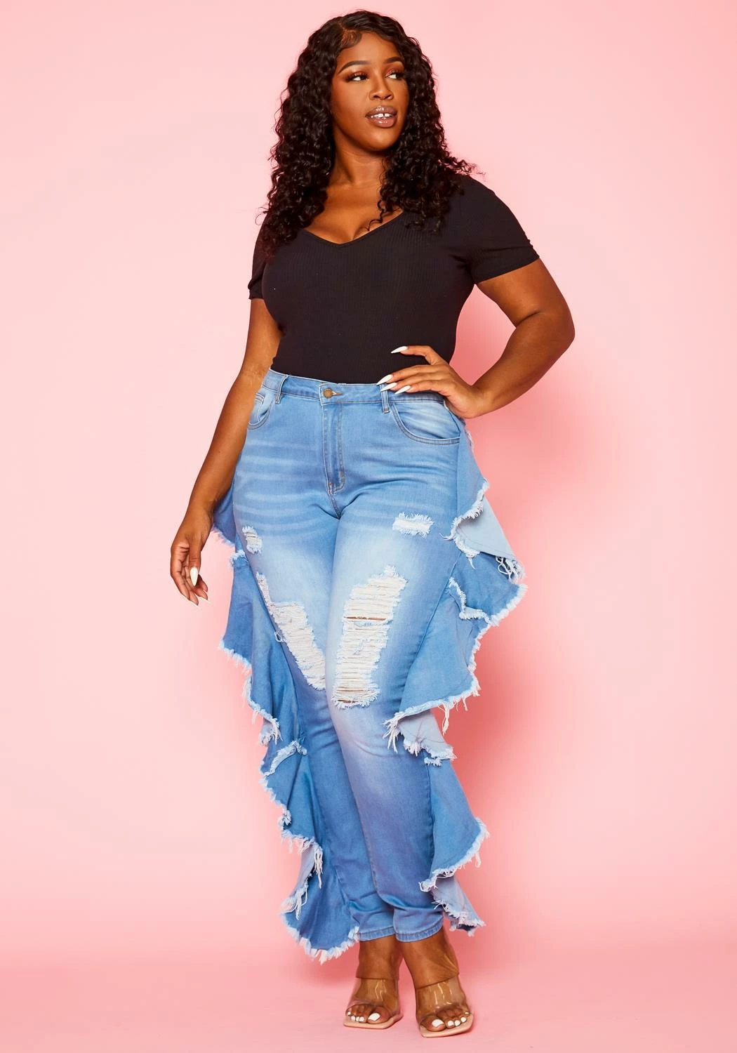 Statement denim jeans in blue wash, ruffle hem details, distresses and pocket hem.