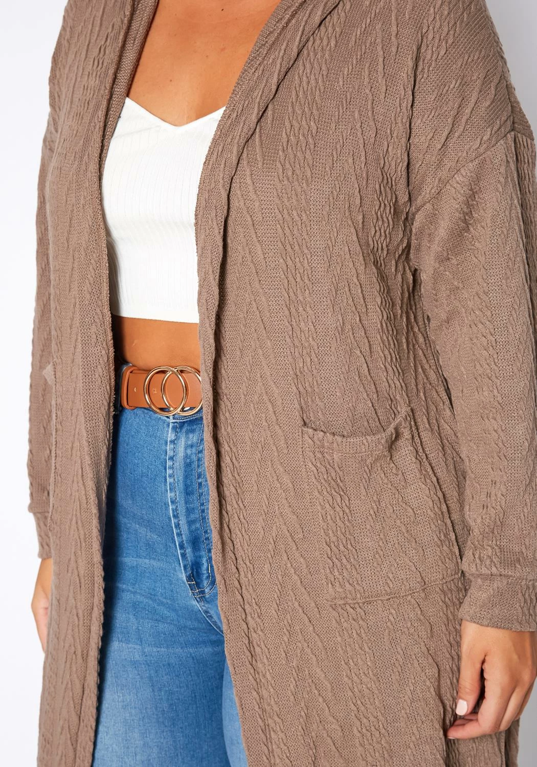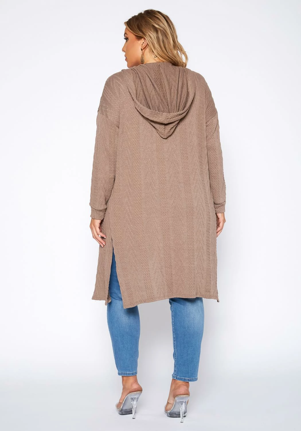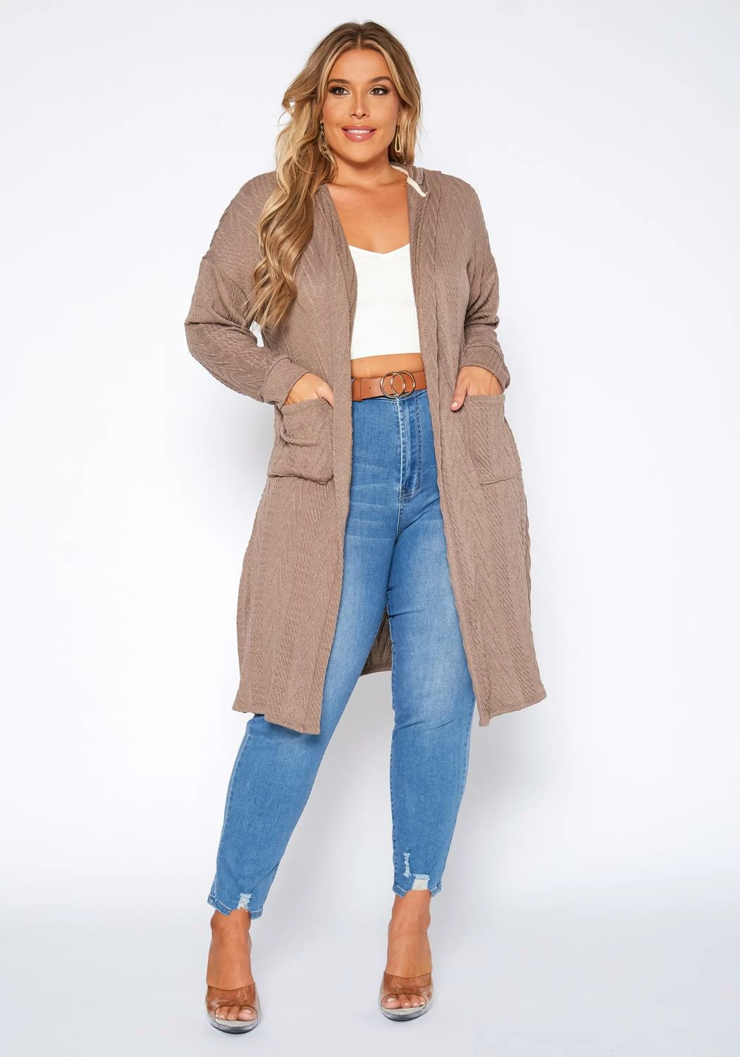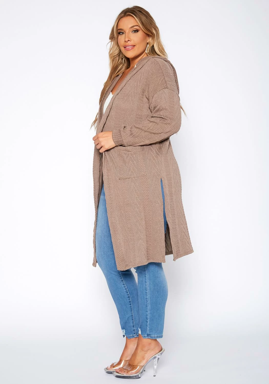 Must have boho knit cardigan for plus size women in open front style, hooded design, long length and pocket hem.