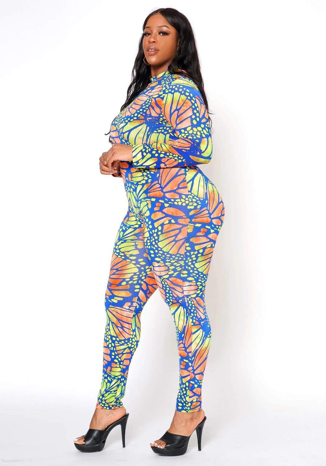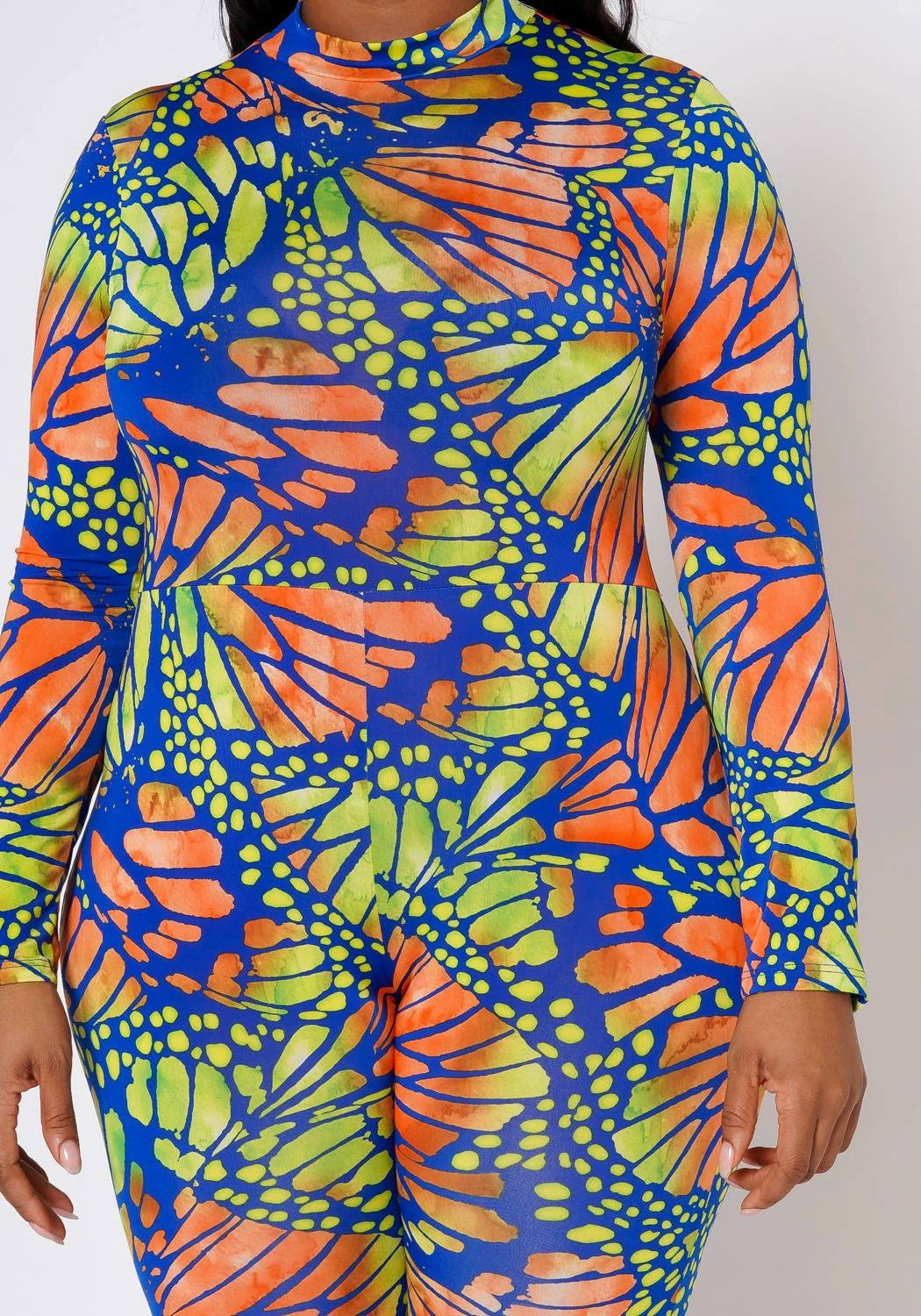 Outstanding plus size women’s fitted jumpsuit in butterfly print, mock neck and long sleeves.