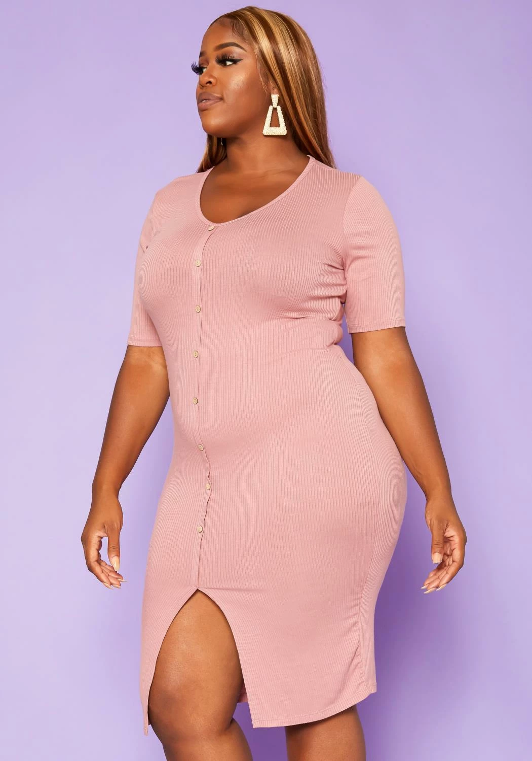 Lovely basic midi dress for plus size women in ribbed knit material, button front details, v-neck style, short sleeves and centered slit hem.