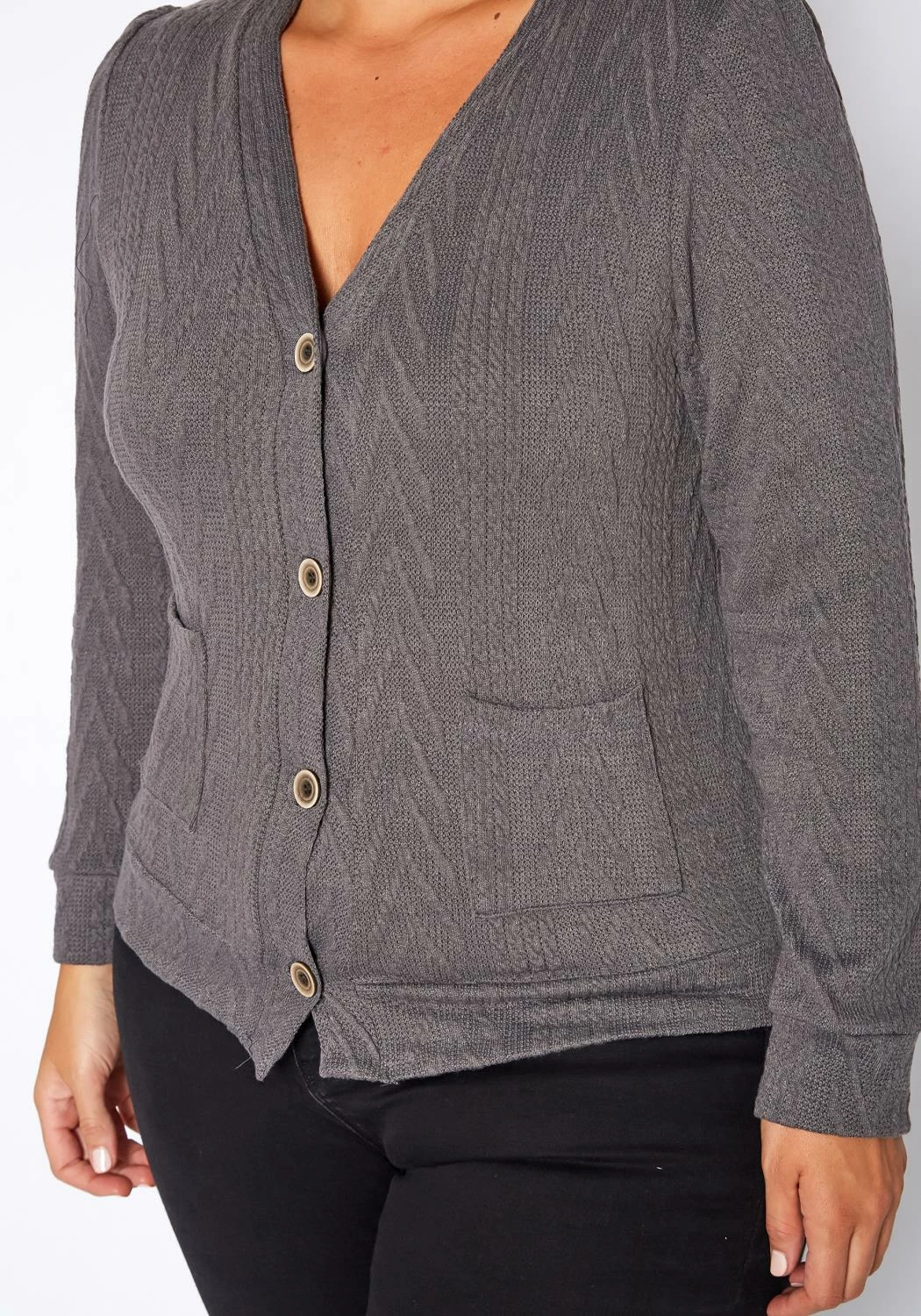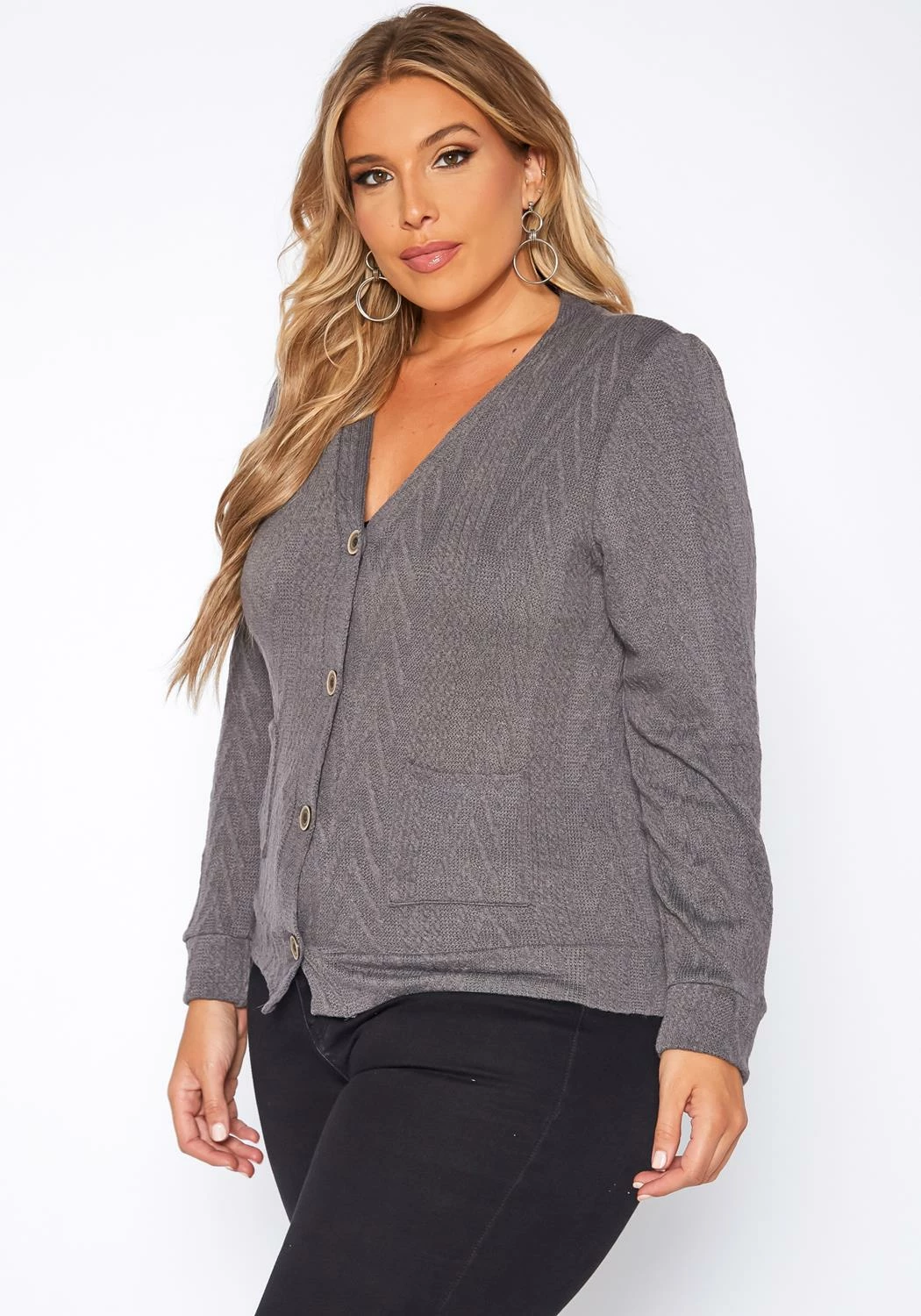 Plus size women’s casual cable knit cardigan in v-neck style, button front closure, long sleeves, fitted wrist cuffs and pocket hem.