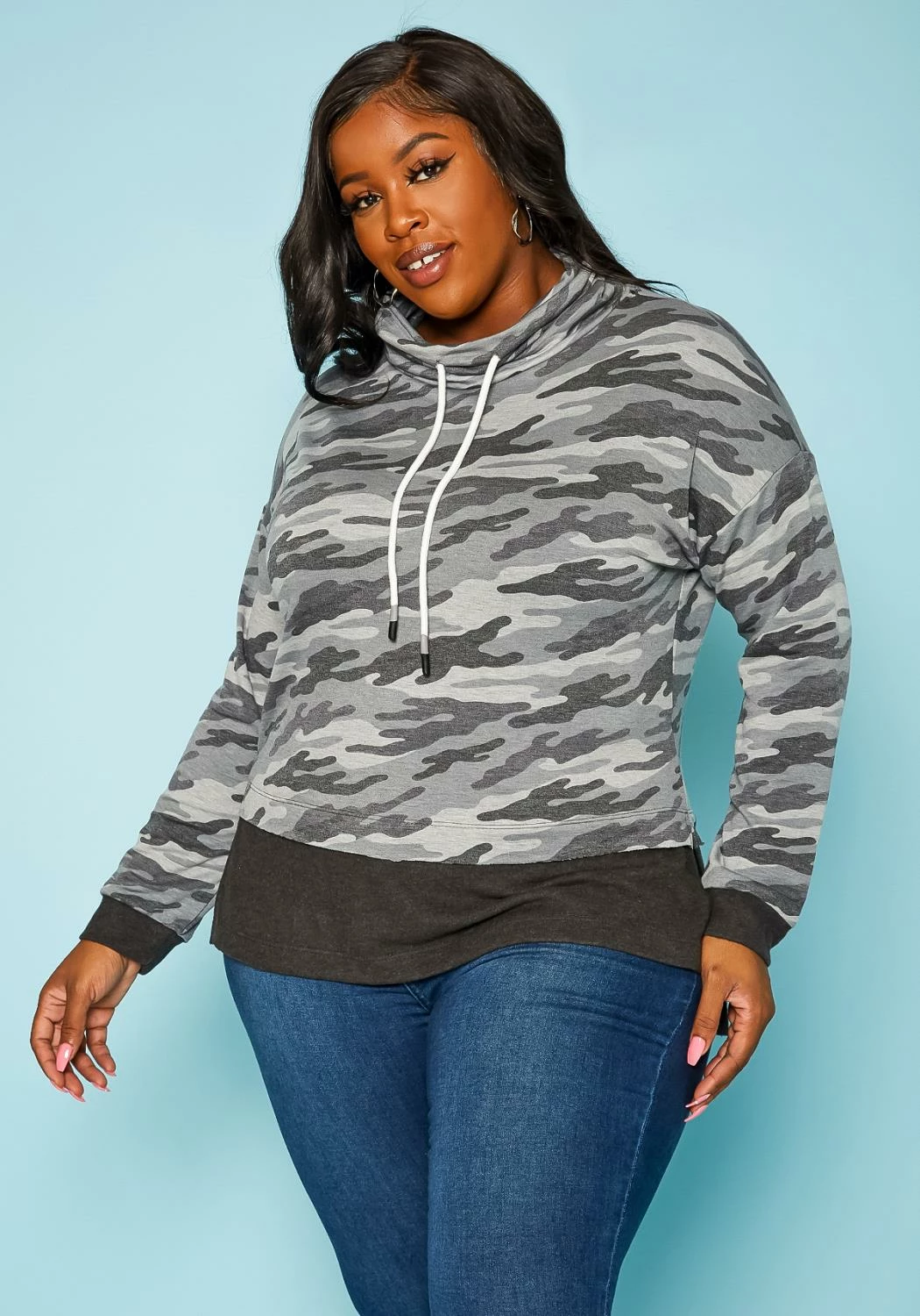 Casual plus size women’s camo pattern sweater in funnel neck style, drawstring hem and fitted wrist cuffs.