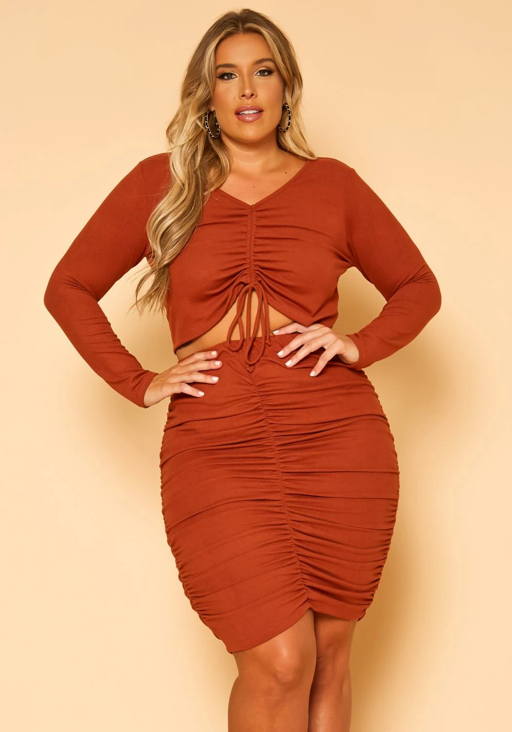 Favorite plus size women’s matching set with centered drawstring hem, v-neck style, long sleeve crop top and high waist bodycon mini skirt.