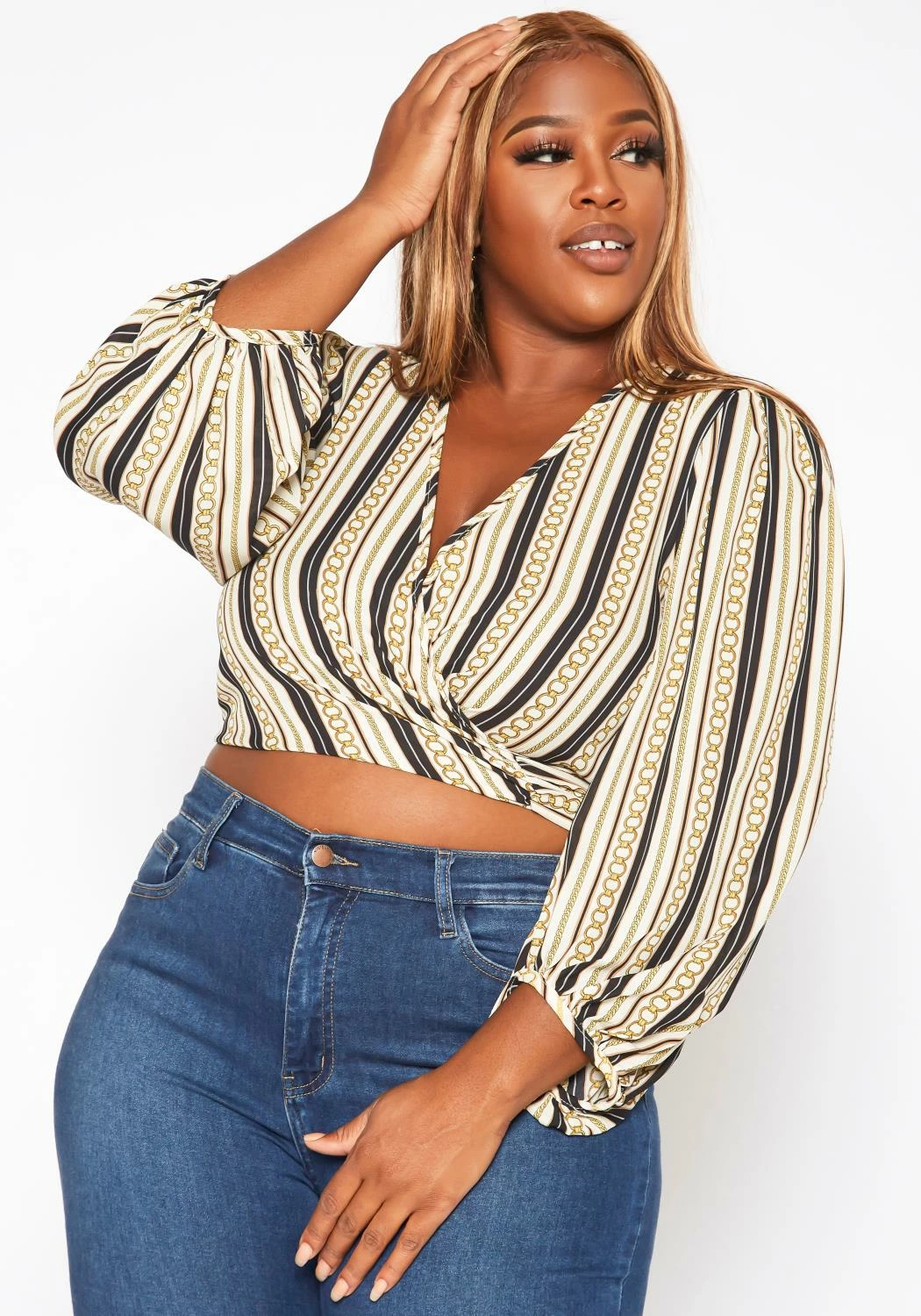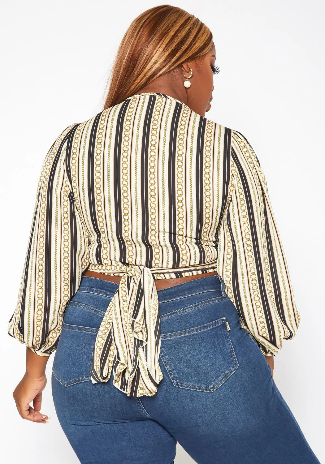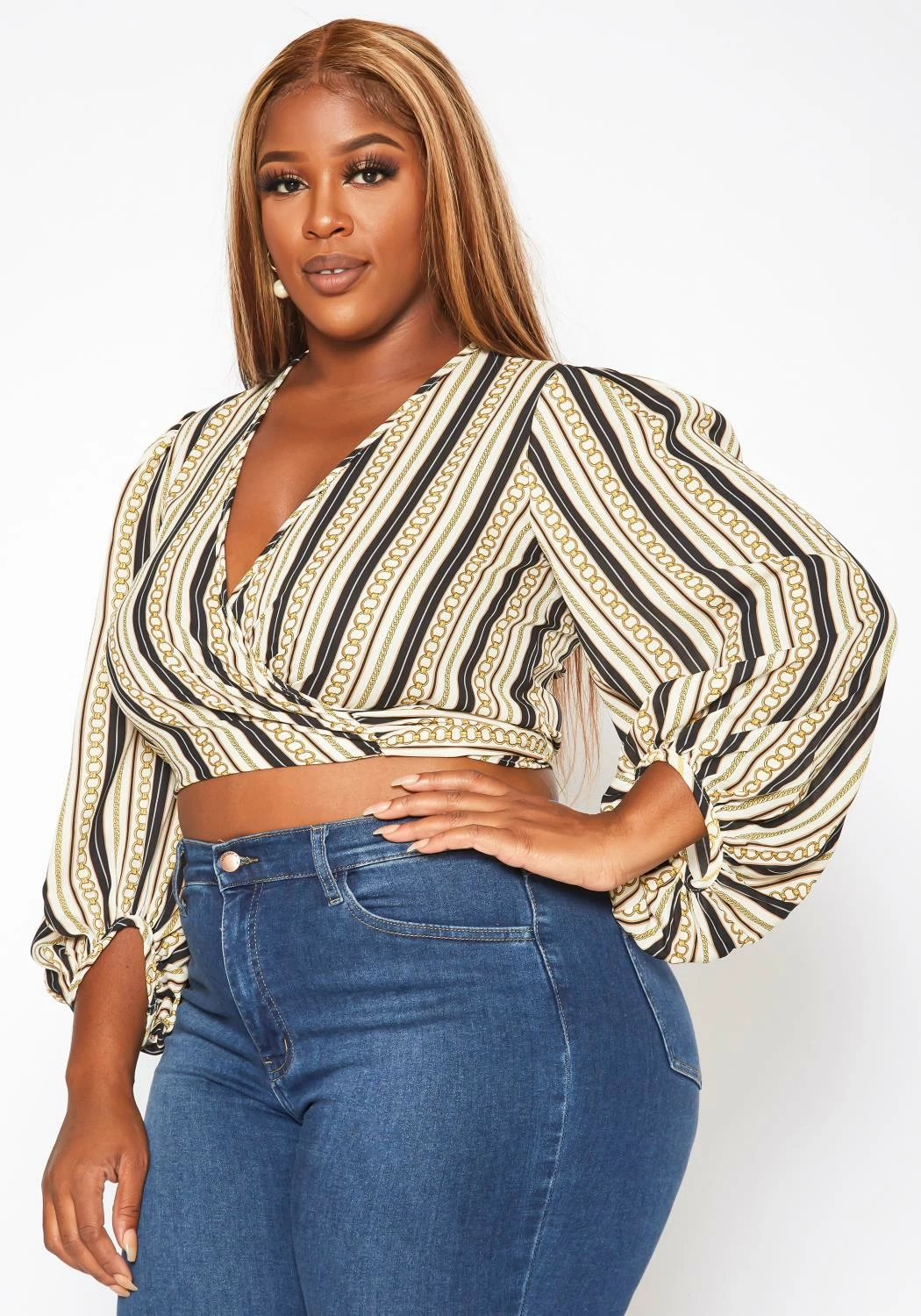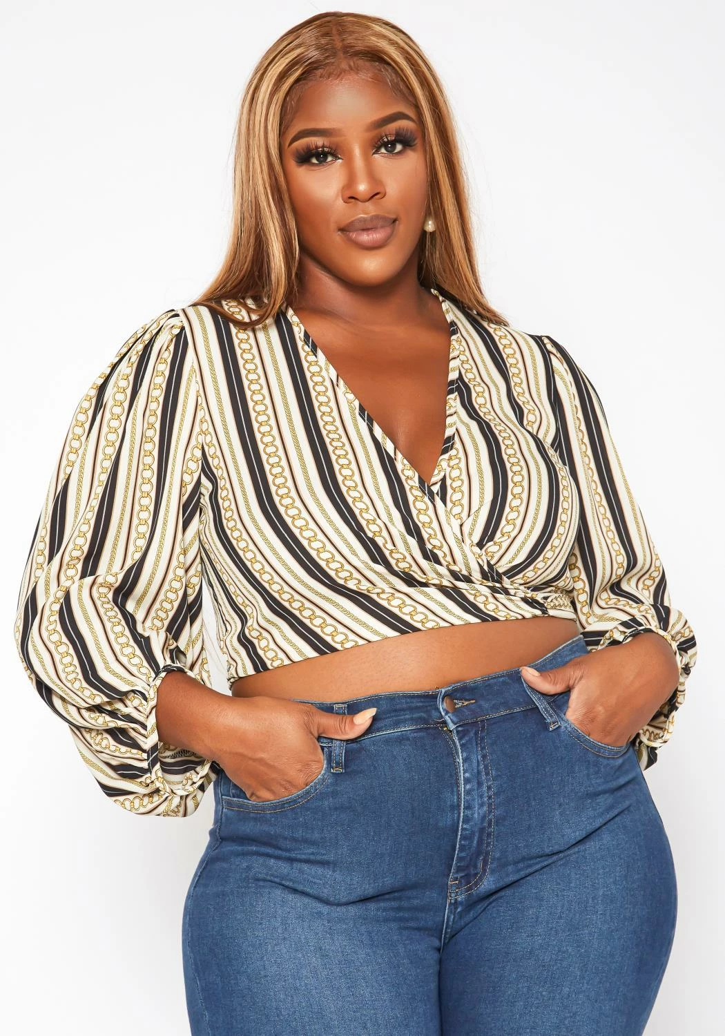 Lovely plus size women’s wrap crop top in chainlink-striped print mix, v-neck style, puffy long sleeves, elastic wrist cuffs and wrap self-tie closure.