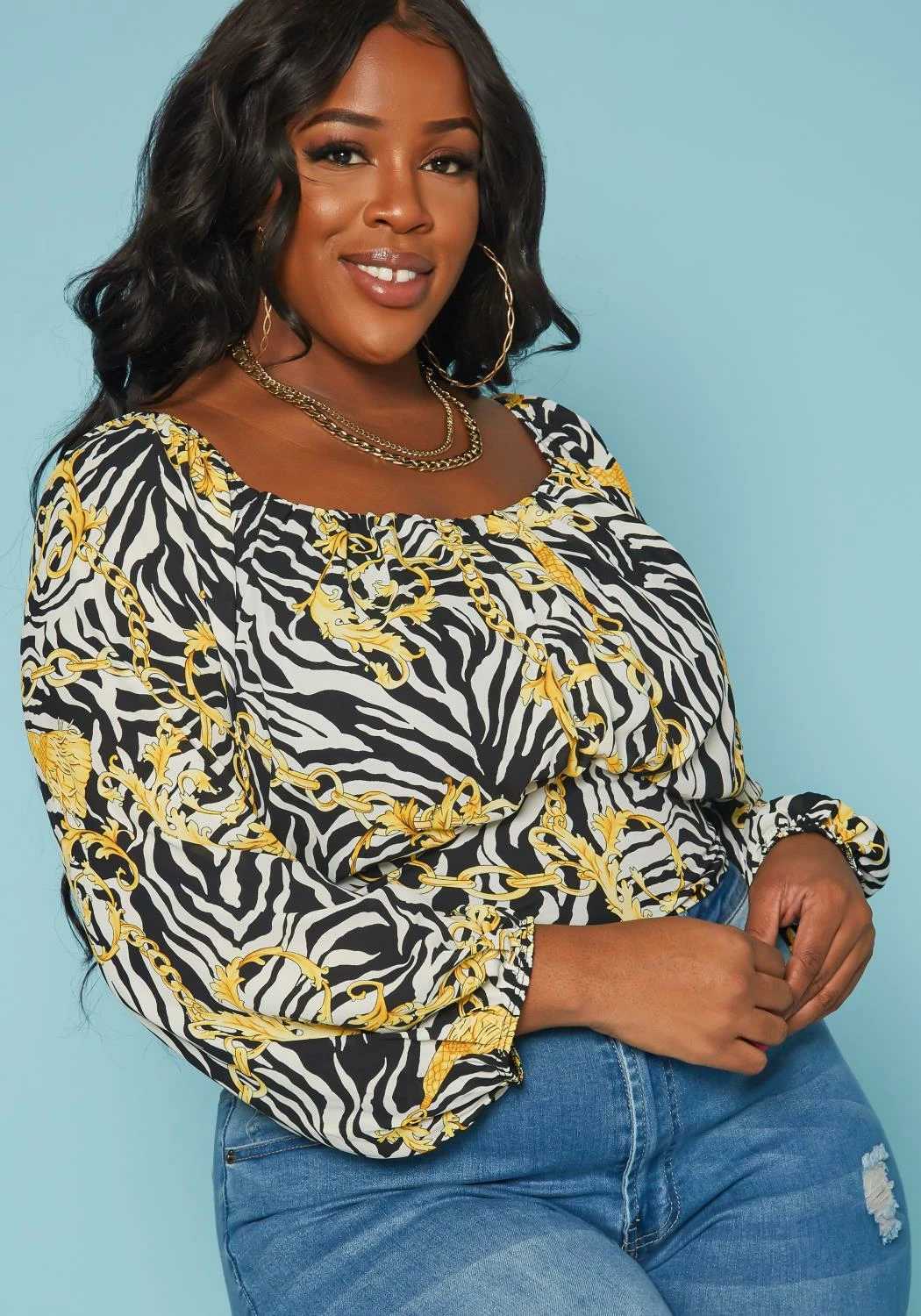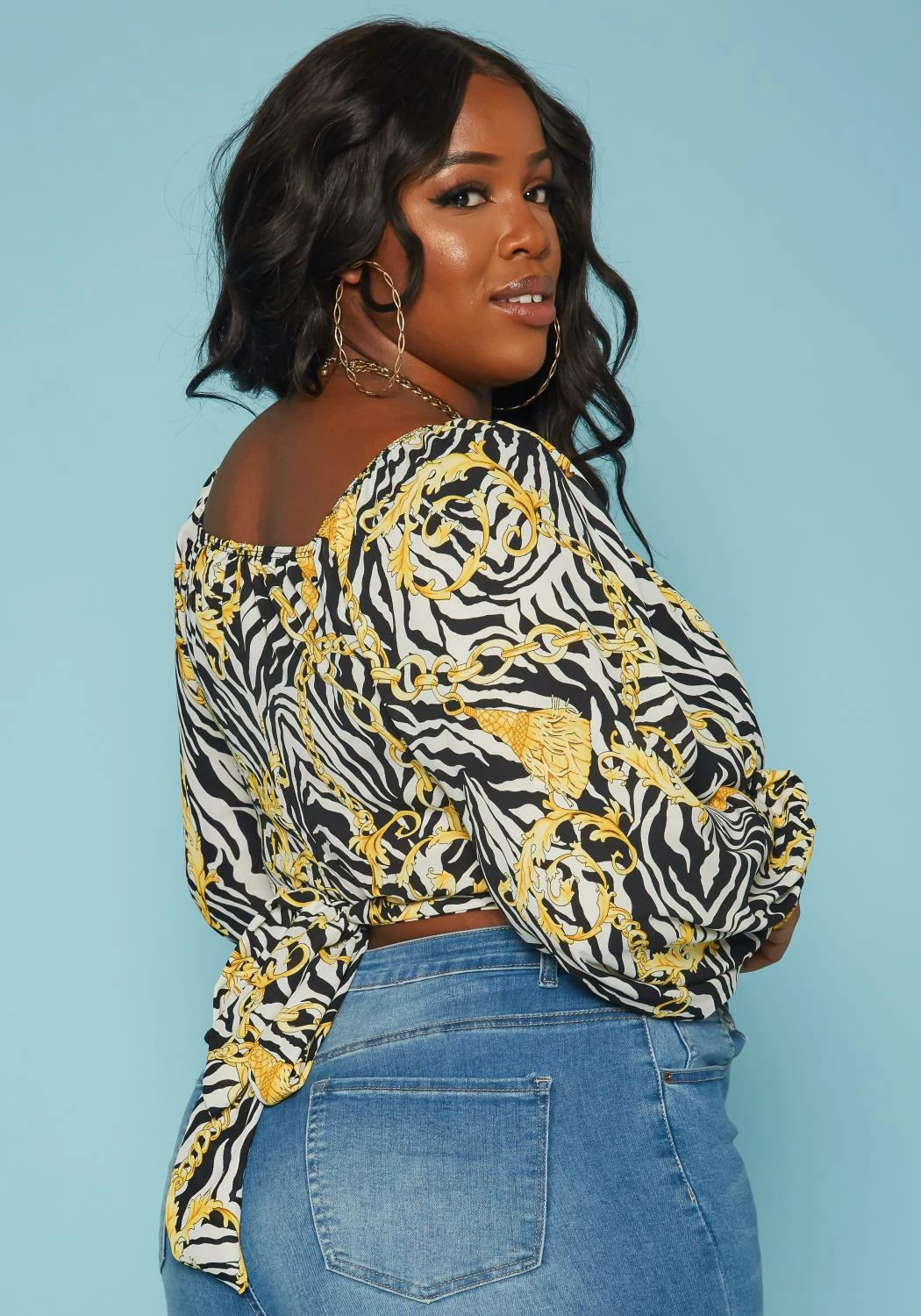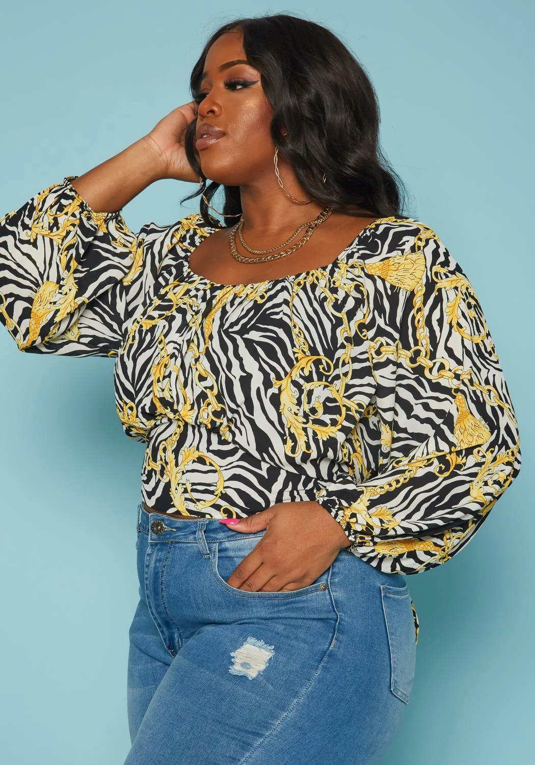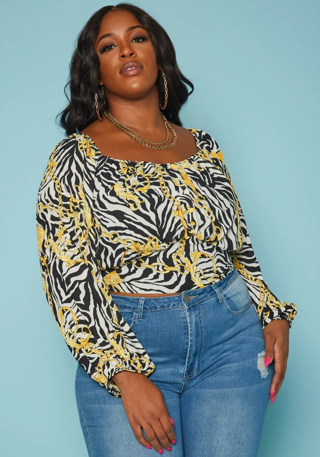 Plus size women’s multi print blouse in square neck style, long sleeves with elastic wrist cuffs and back tie closure.