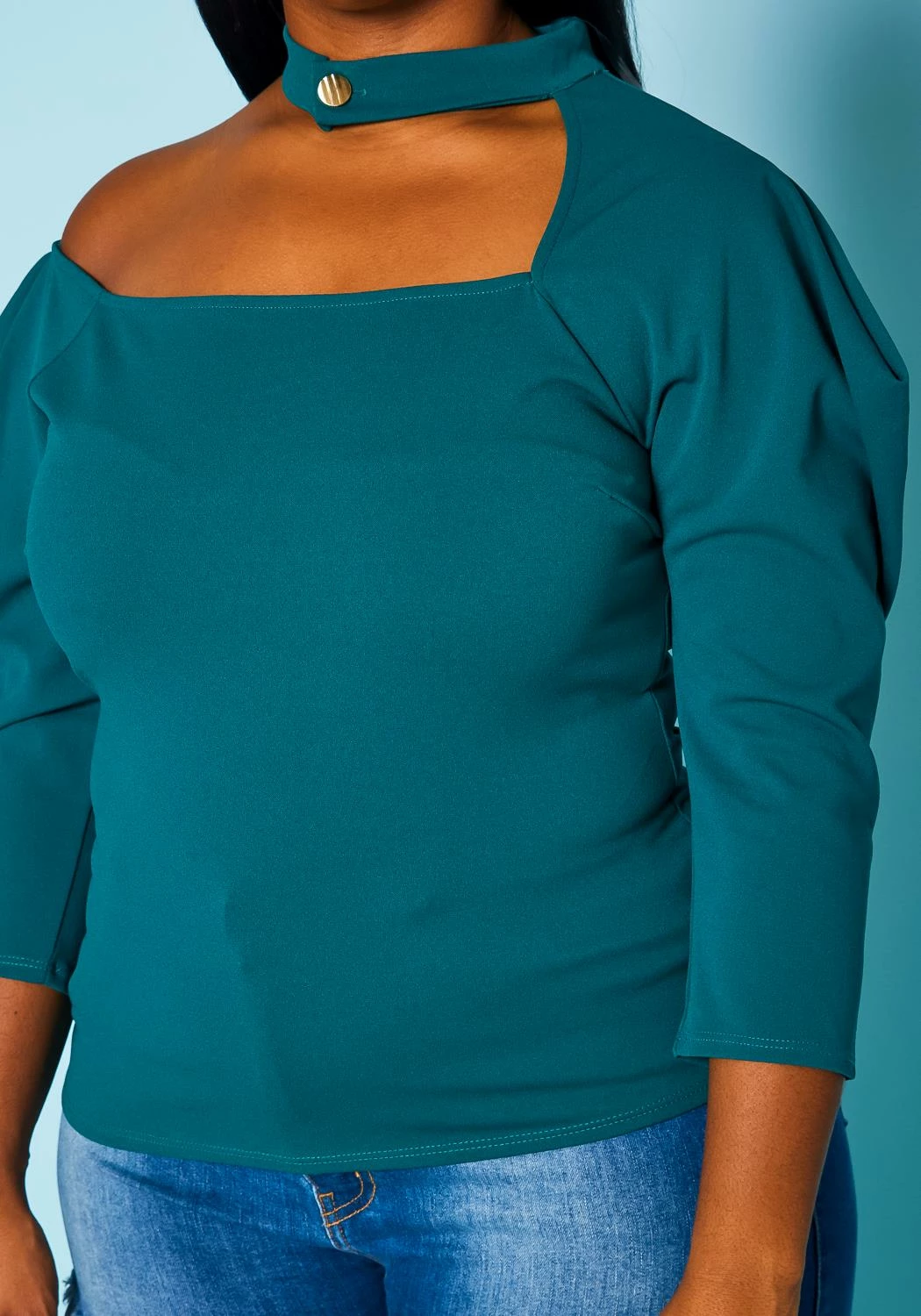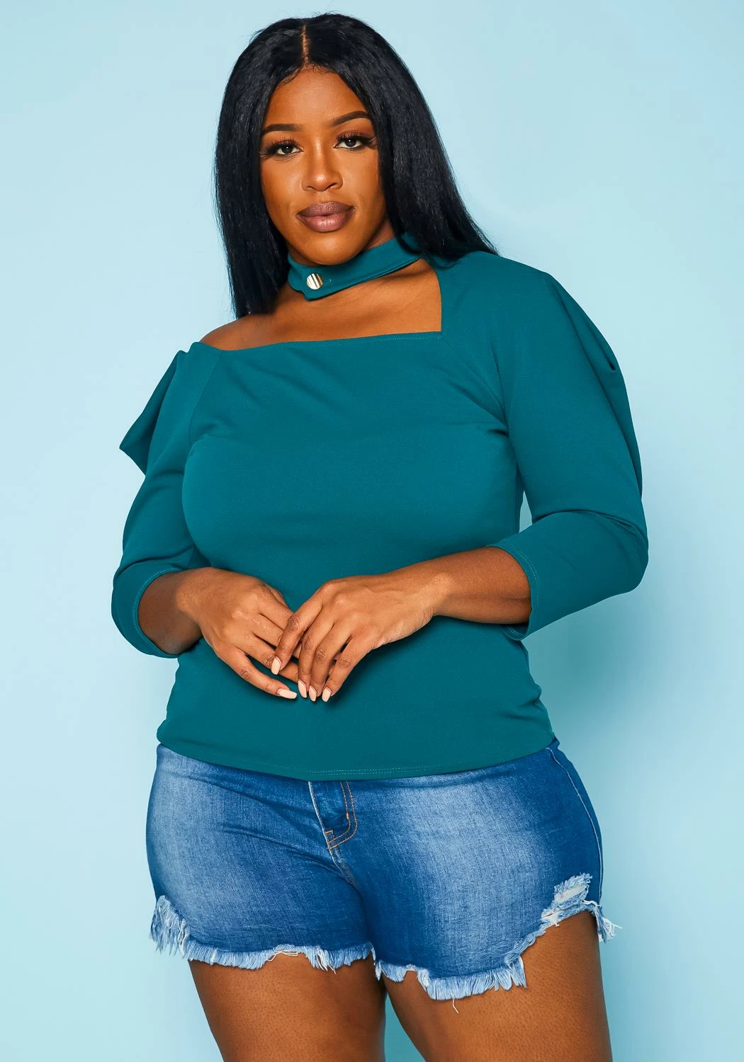 Plus size women’s top with choker neck detail, cold shoulder hem, puff shoulder design, 3/4 long sleeves and slim fitting.