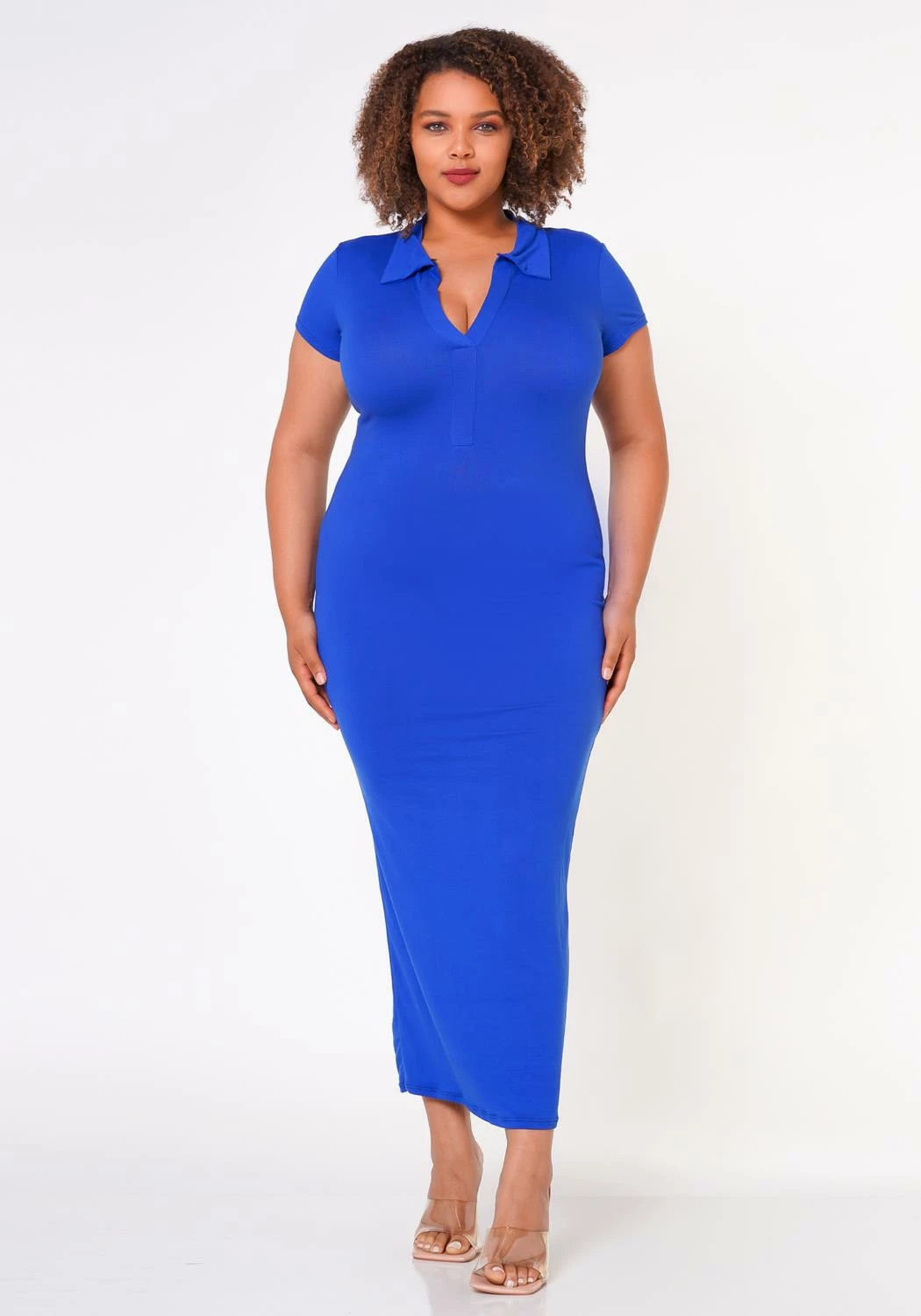 Summer essential plus size women’s bodycon maxi dress in collar v-neck style, short sleeve and form fitting soft to the touch material.