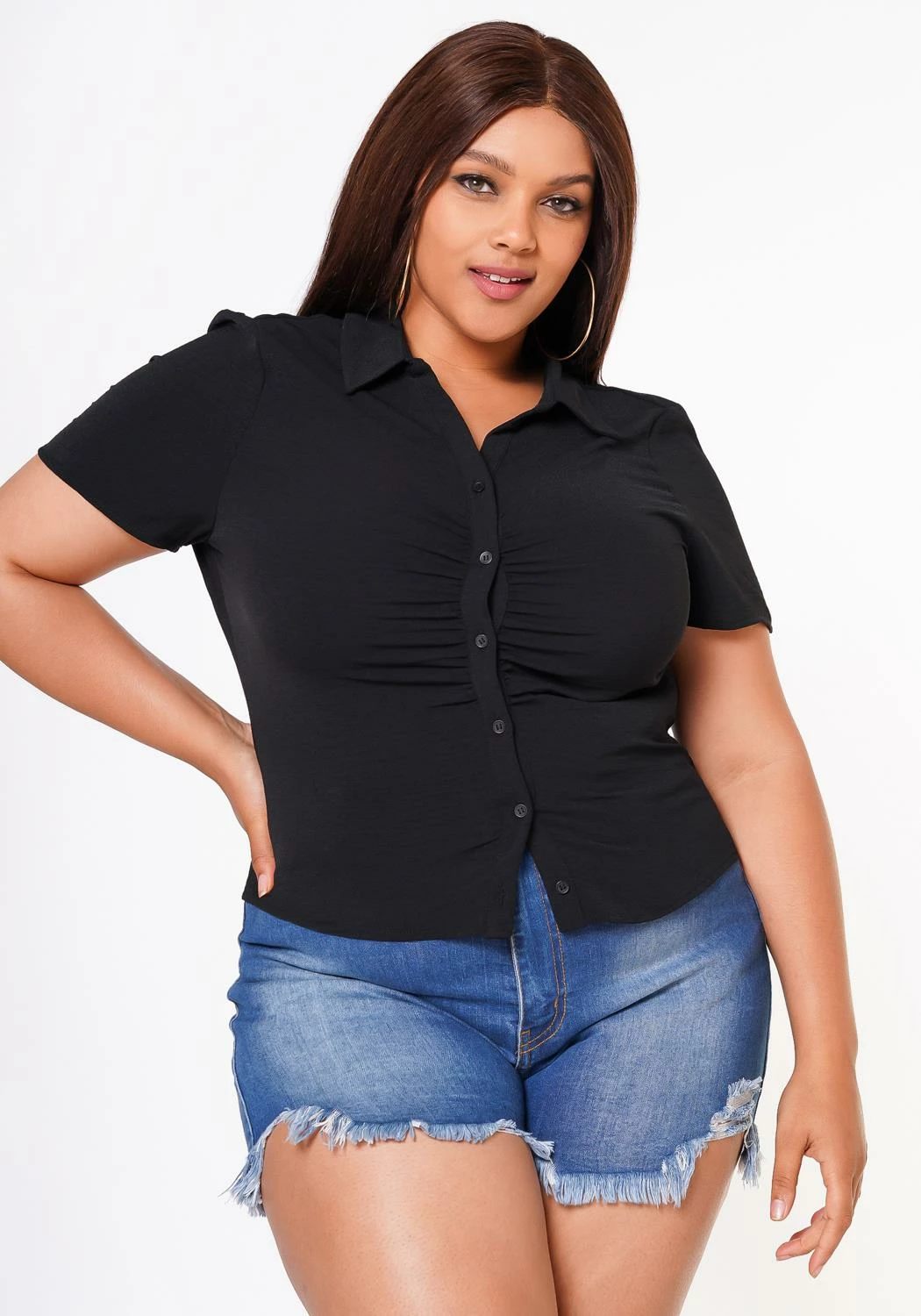 Must have plus size women’s fitted top in collar neck style, button front lining and short sleeves.