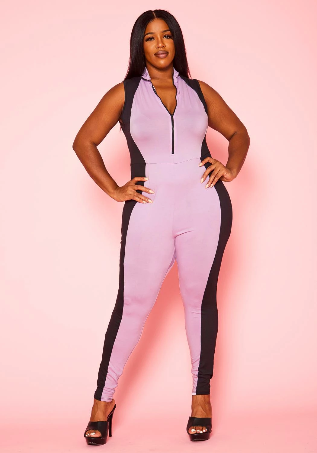 Trendy jumpsuit for plus size women in color block design, bodycon fit, zipper front hem and high neck style.