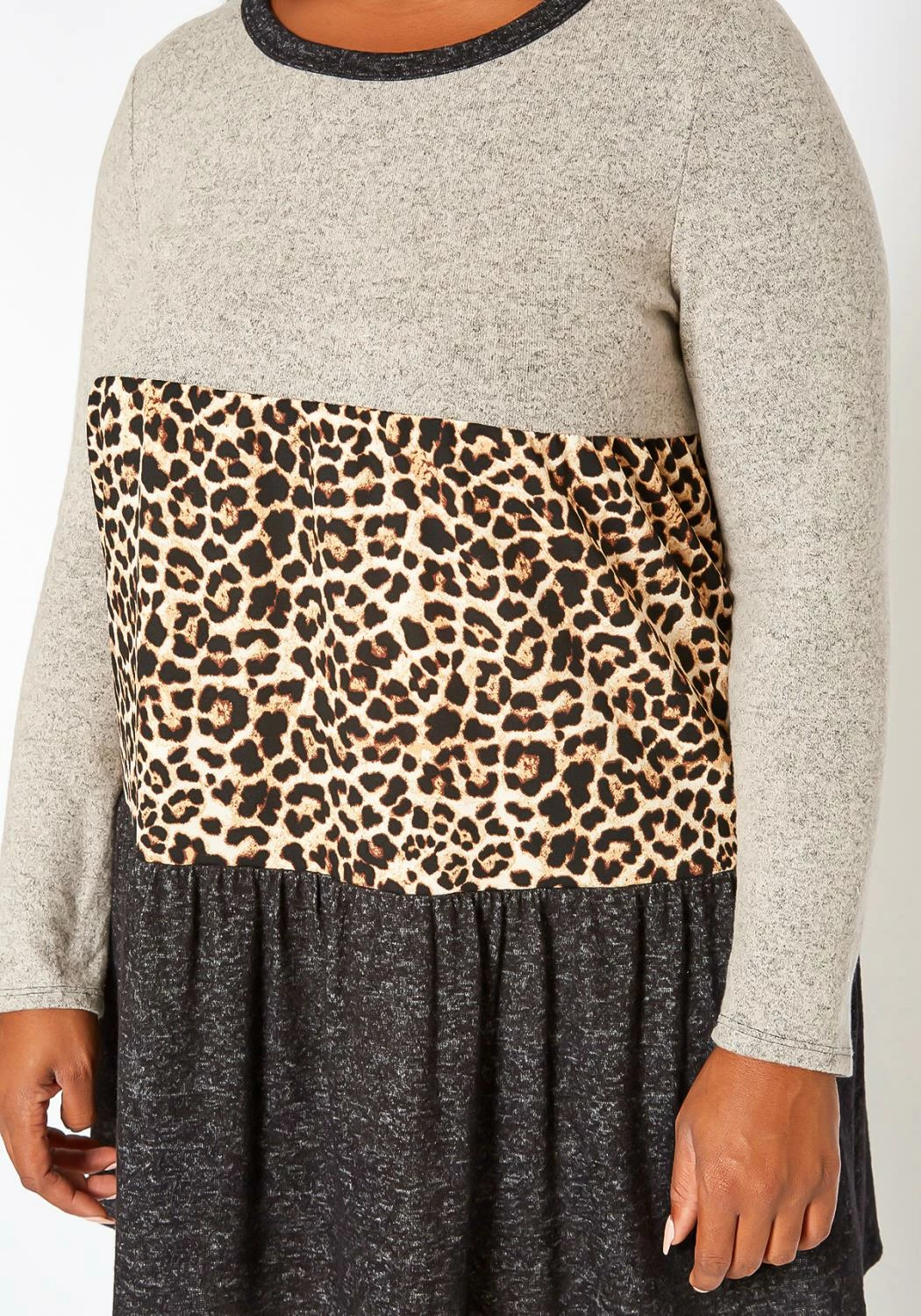 Casual plus size women’s flare mini dress in color block design with leopard print, round neck style, fitted long sleeves and soft knit material.