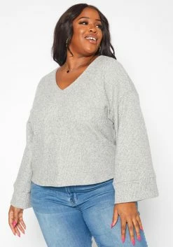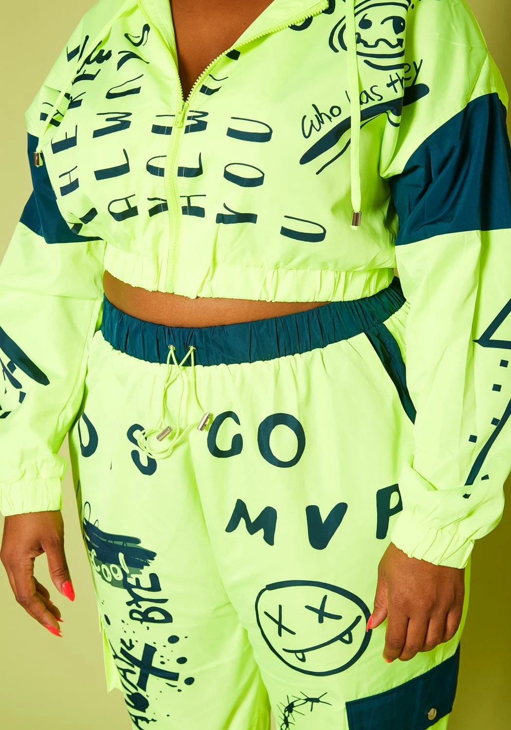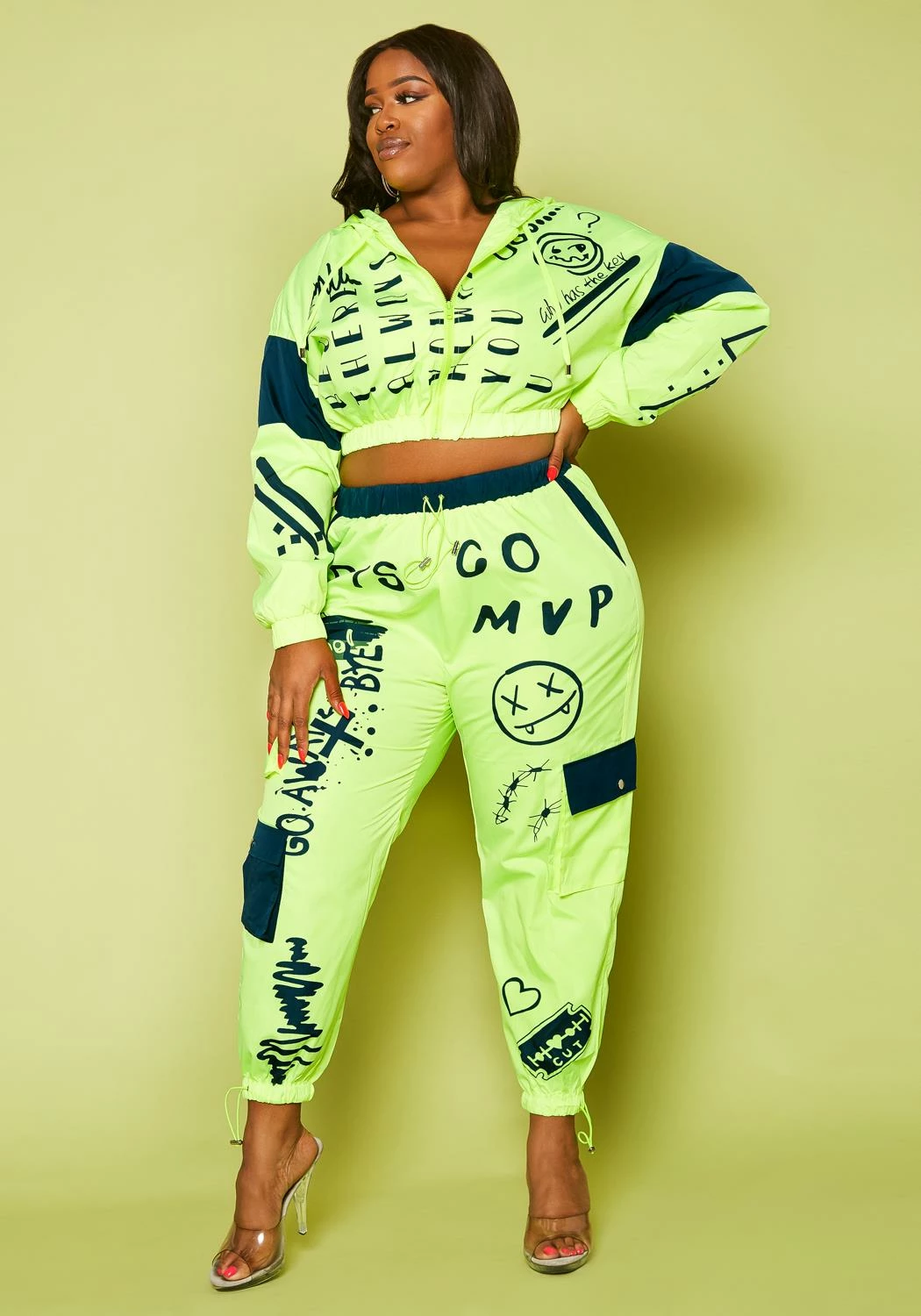 Plus size women’s set featuring a cropped hoodie, elastic waist hem, long sleeve cuff hem, front zipper closure paired with cuff leg pants featuring hip & leg pockets & adjustable cord string detail.