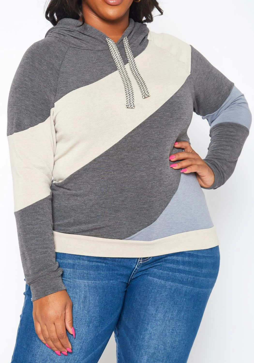 Plus size women’s basic hooded sweater in color block design, hoodie drawstrings and lightweight fitting.
