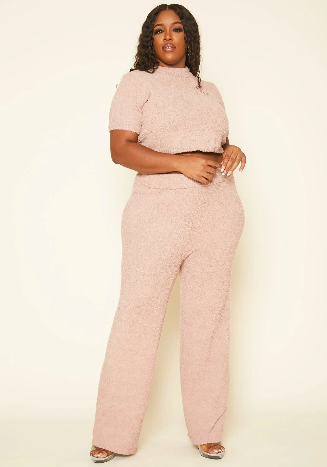 Comfort during winter just got better in this cozy knit matching set! Features a mock neck style, short sleeve crop top and mid rise pants.