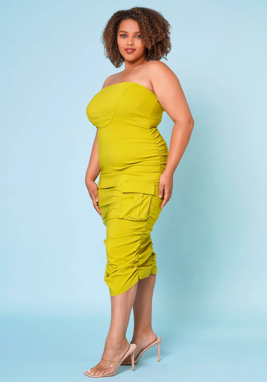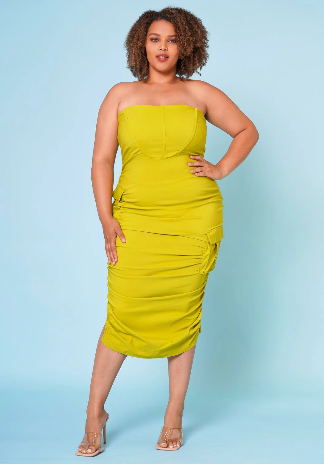 Plus size woman’s ruched bodycon tube dress featuring top corset detailing, army pockets and back zip up access.