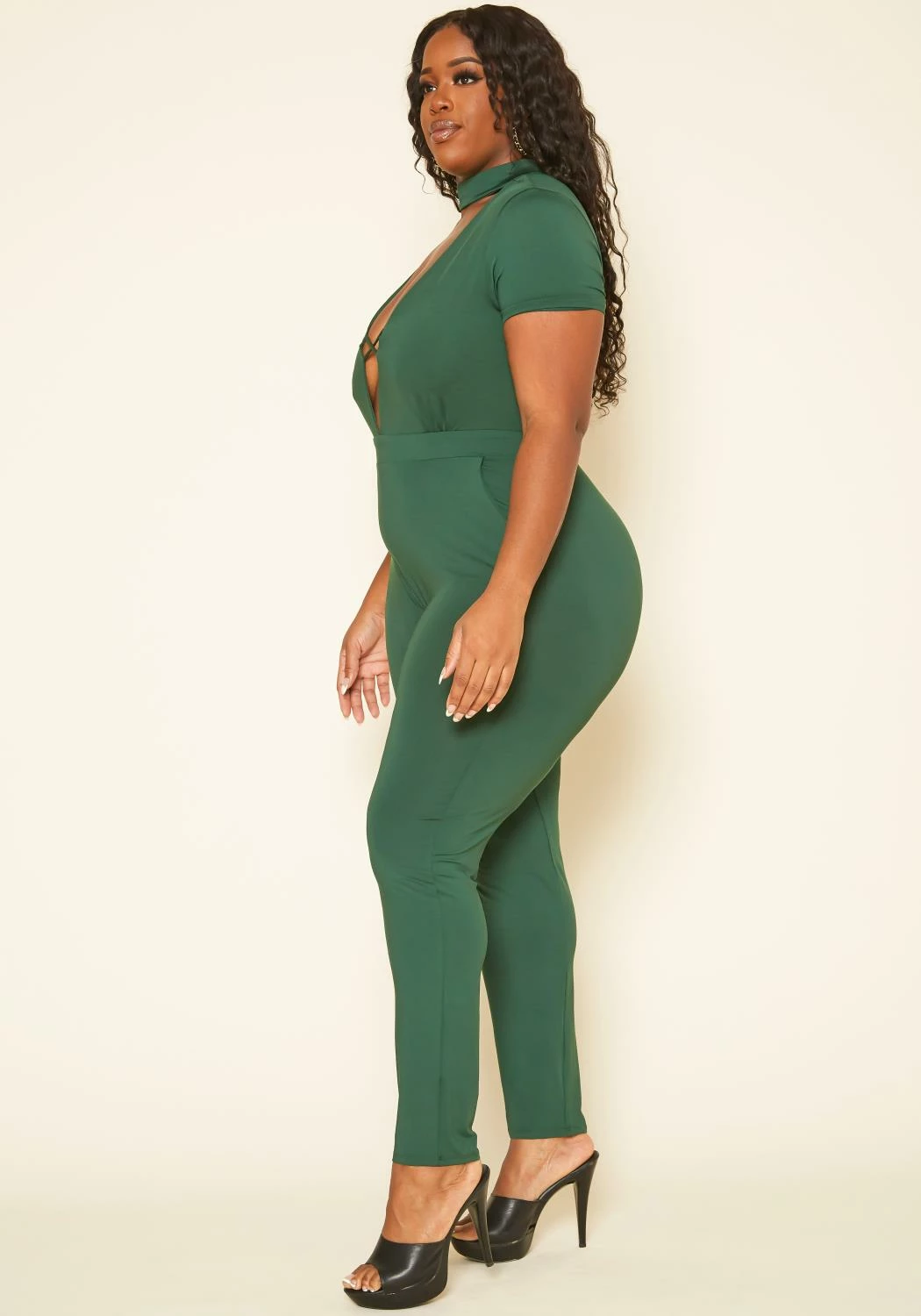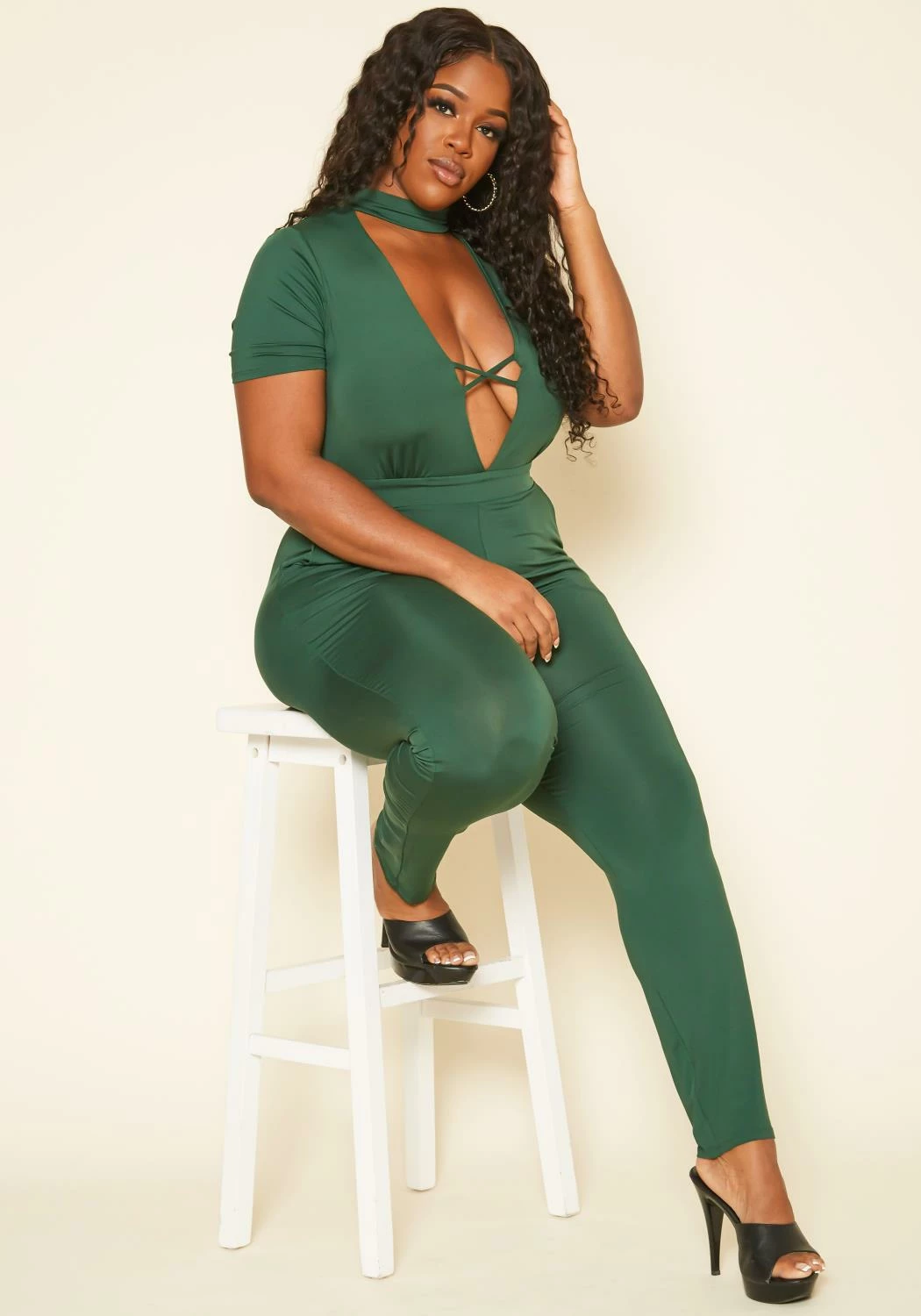 Stunning plus size women’s jumpsuit in deep v-neck style, cross-lace front detail, choker neck style, short sleeves, back zipper closure, back button closure and bodycon fitting.
