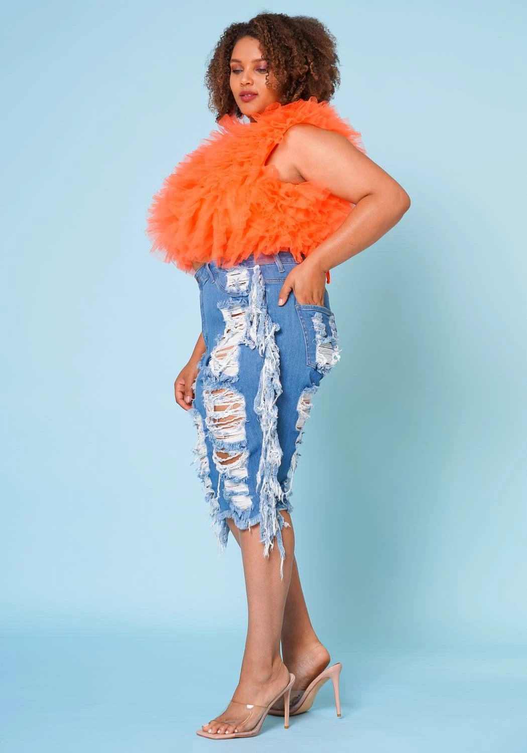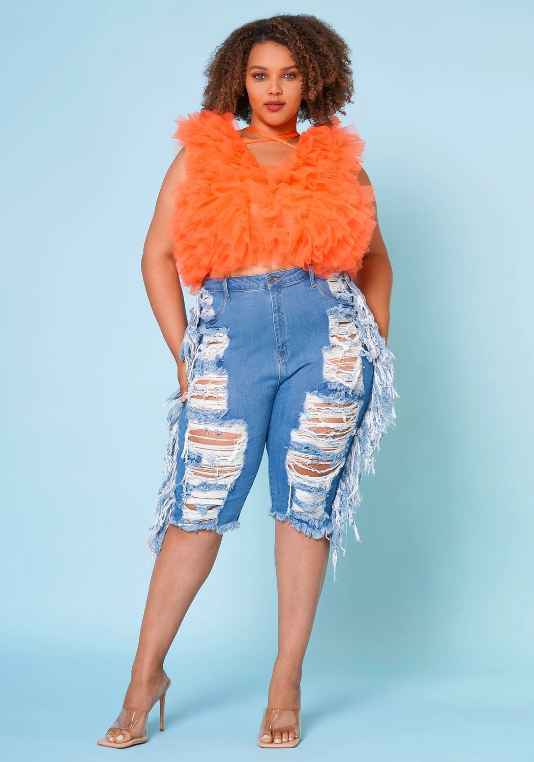 Summer fav denim biker shorts for plus size woman which features a high waist style, distressed front/back hem, belt loop holes and pockets.