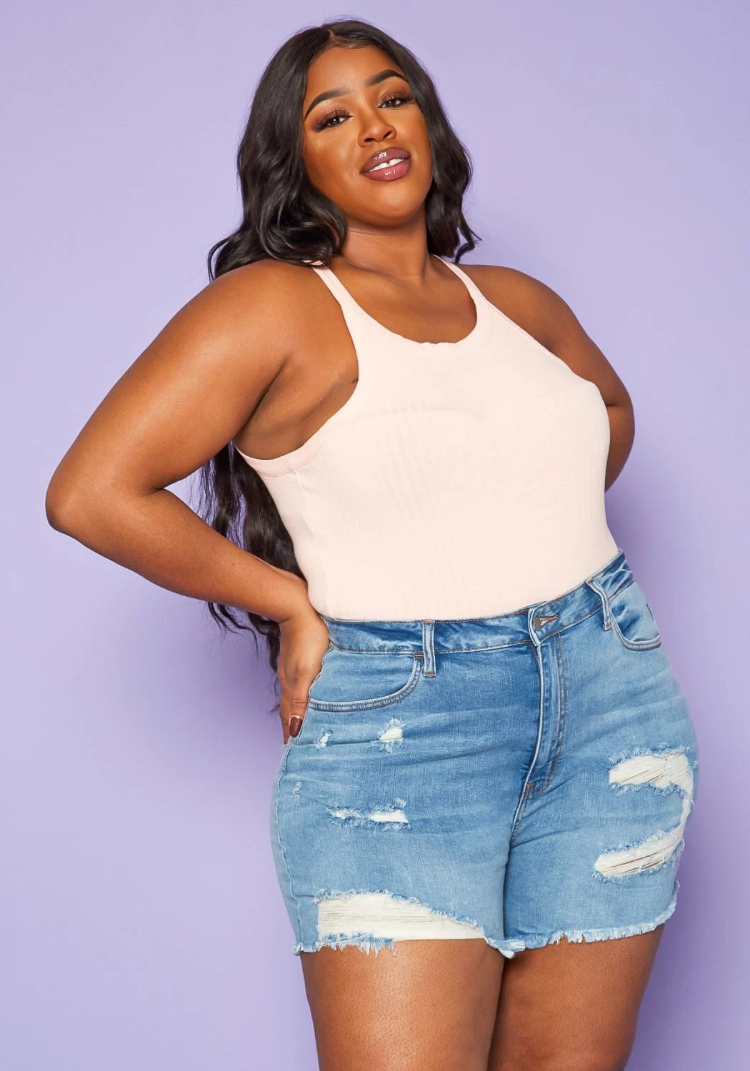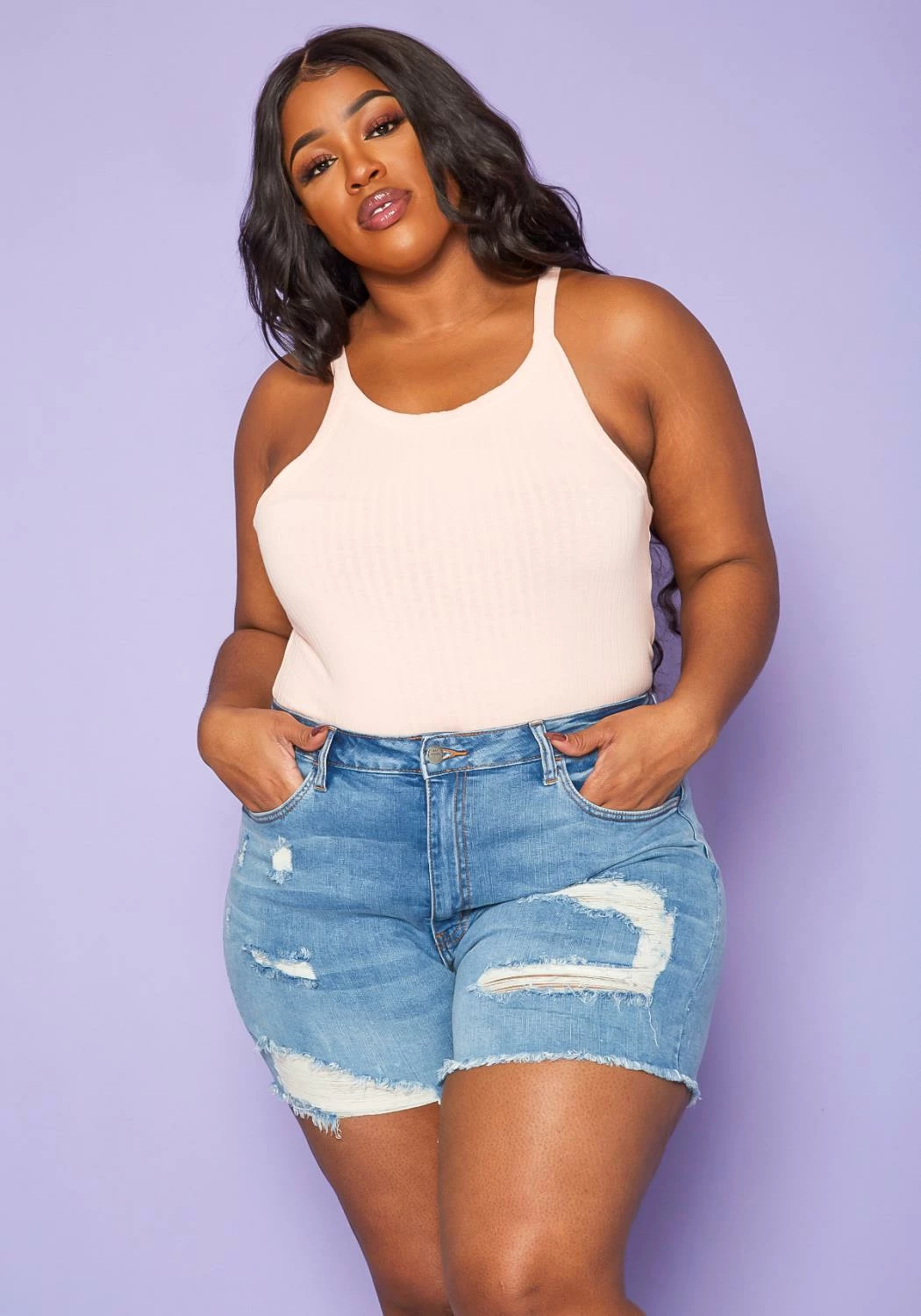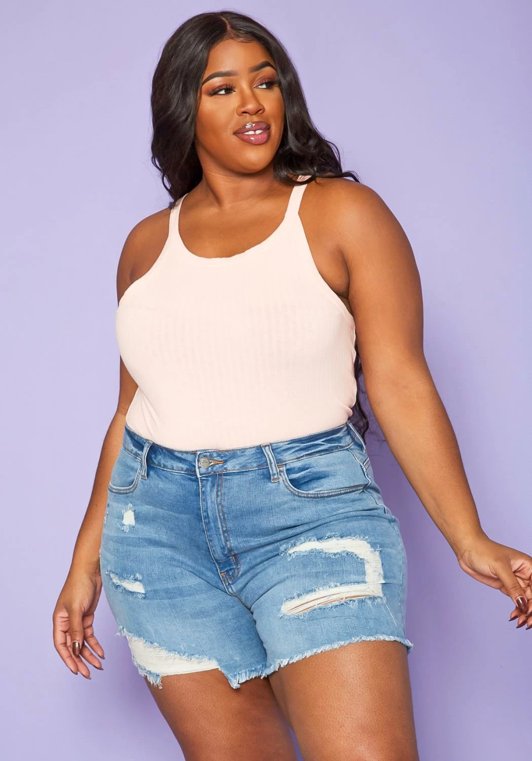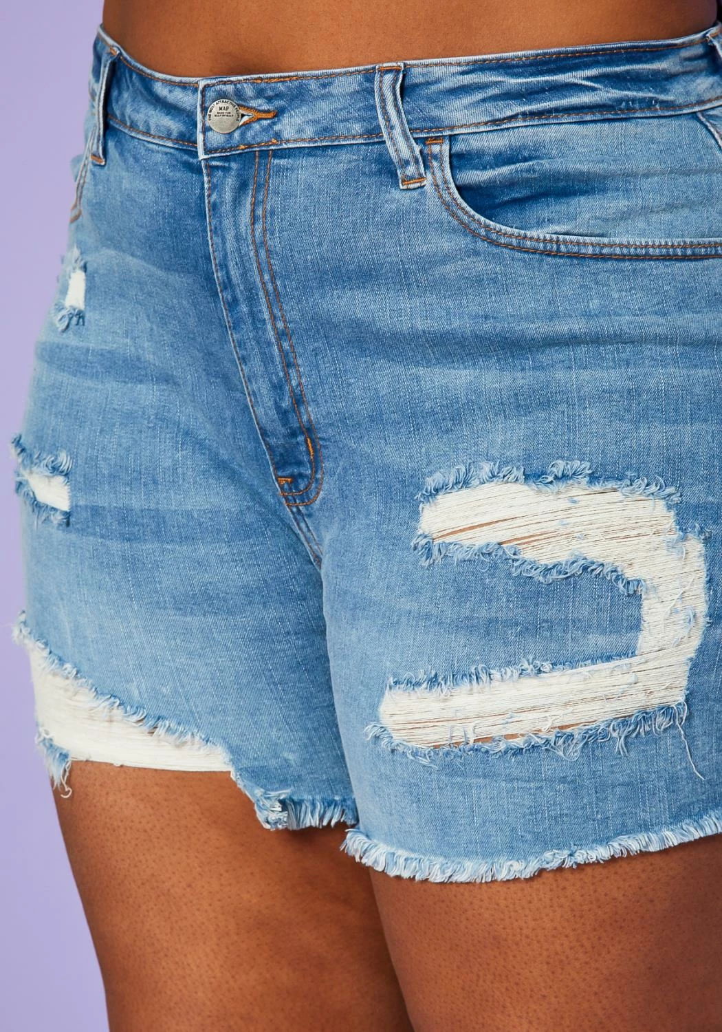 Plus size women’s jean shorts in distressed style with back and front pocket detail and front zipper/button closure.