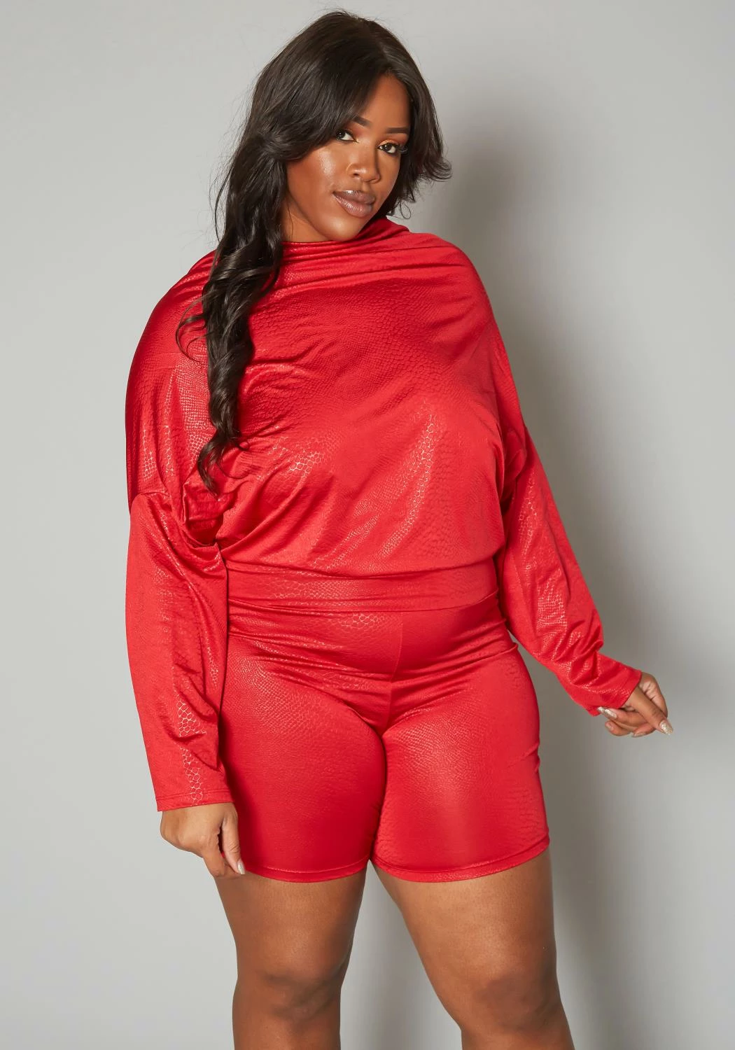 Romantic plus size women’s romper in dolman long sleeve design, open back style, high neck and shimmery material.