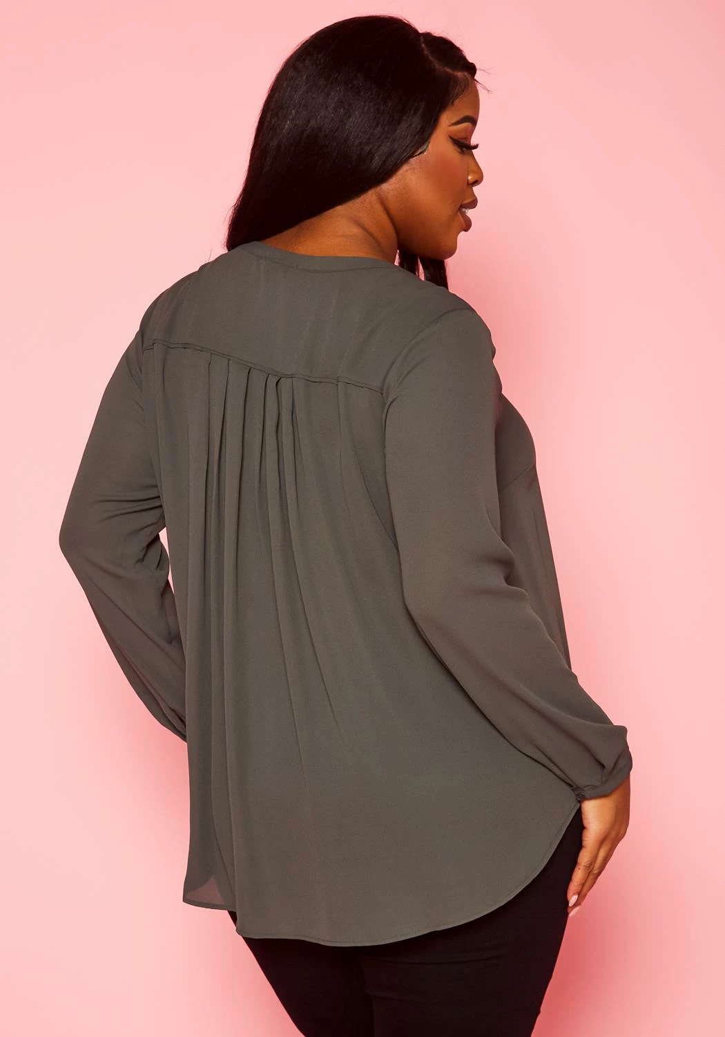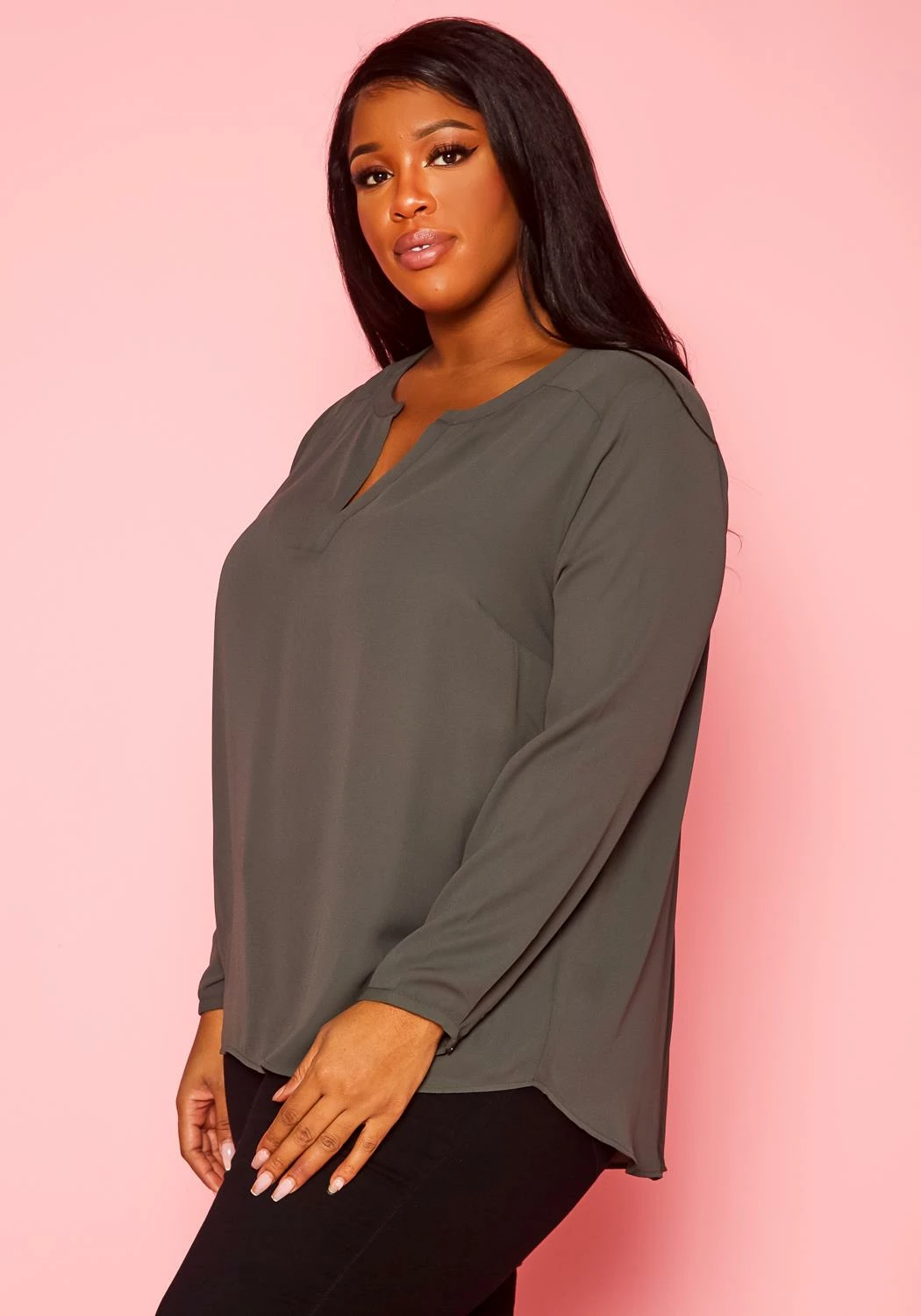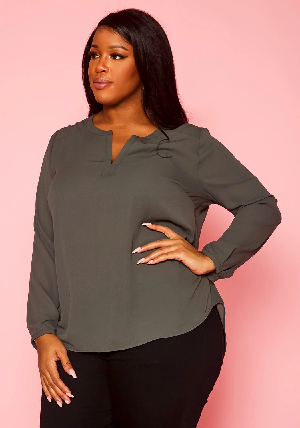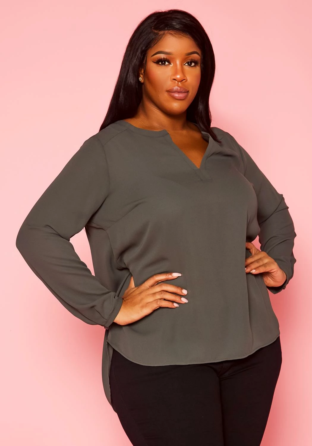 Chic plus size women’s long sleeve blouse in dotted pattern, v-slit neckline and buttoned wrist cuffs.