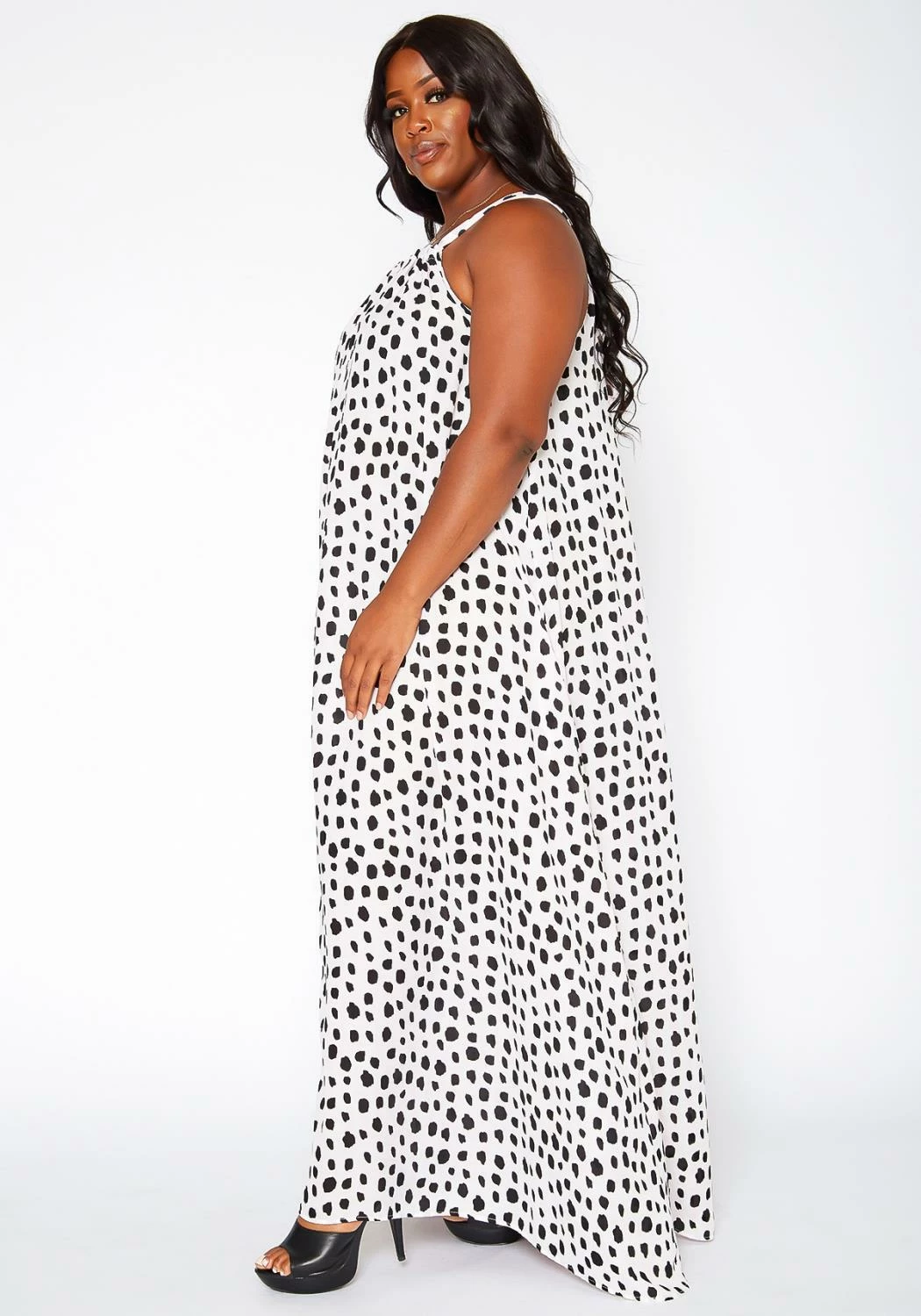 Delightful plus size women’s maxi dress in dotted pattern, sleeveless design, fit to flare end, pocket ascent and self tie closure.