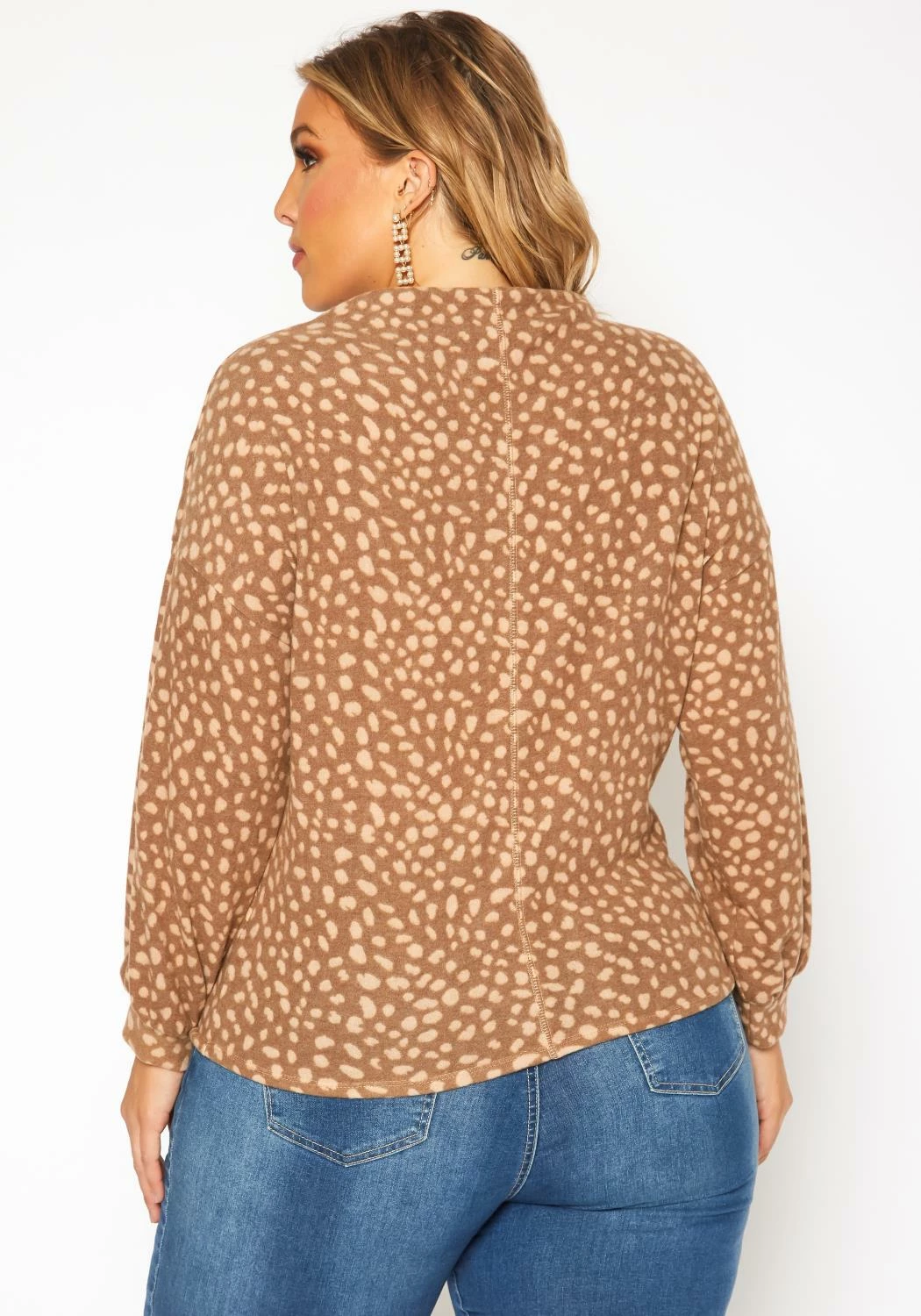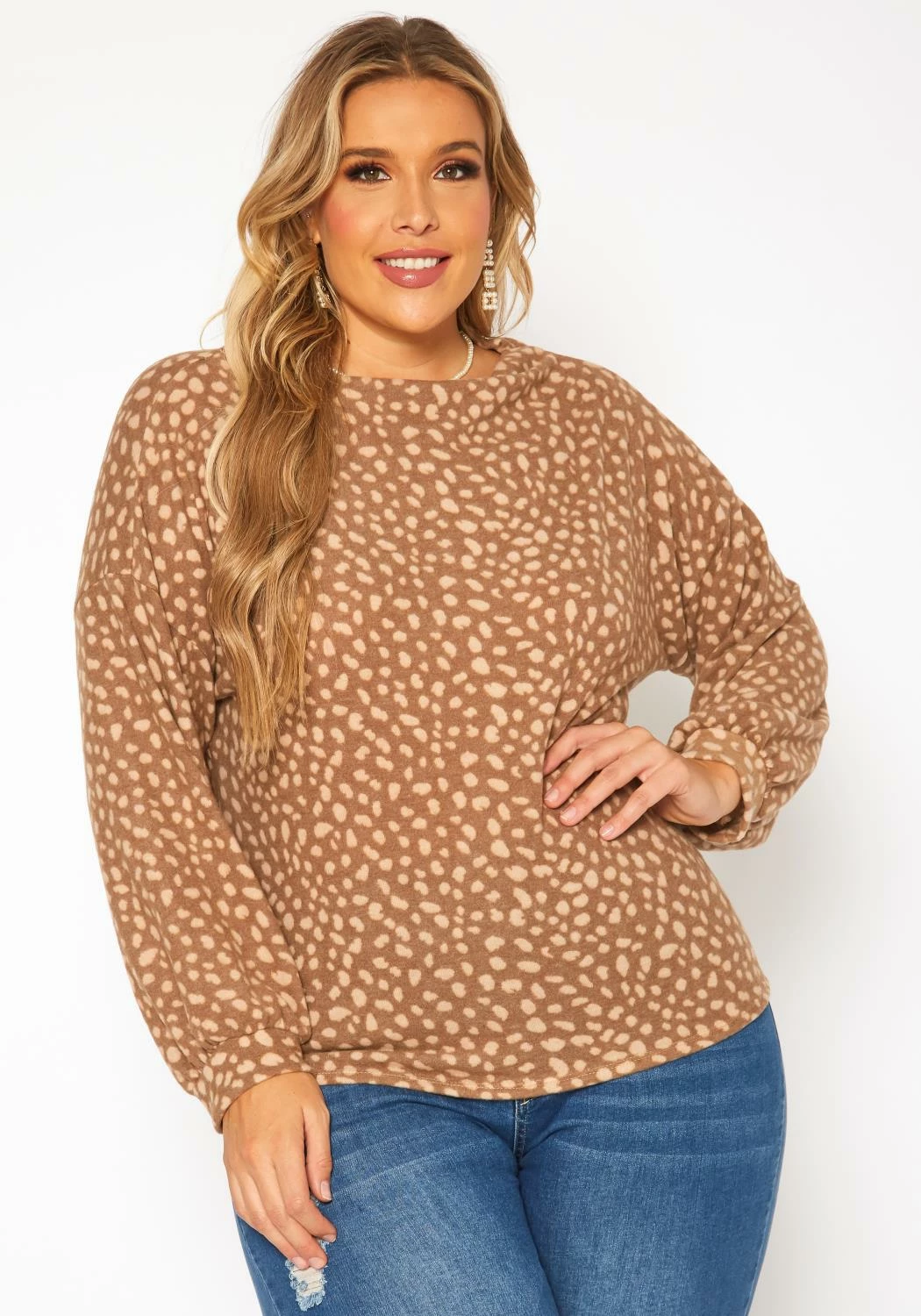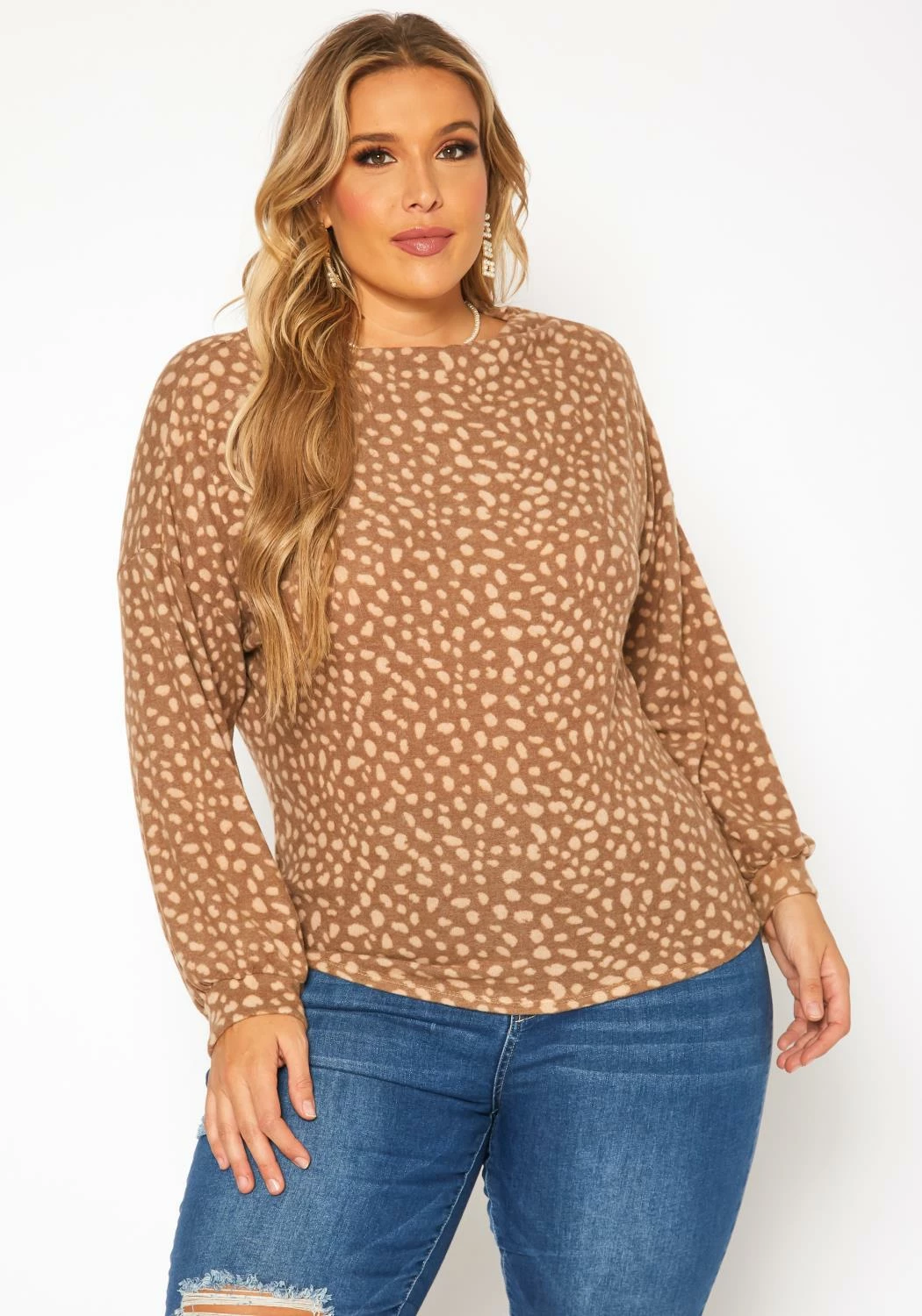 Casual chic plus size women’s sweater in dotted print, wide neck style and long sleeves with fitted wrist cuffs.