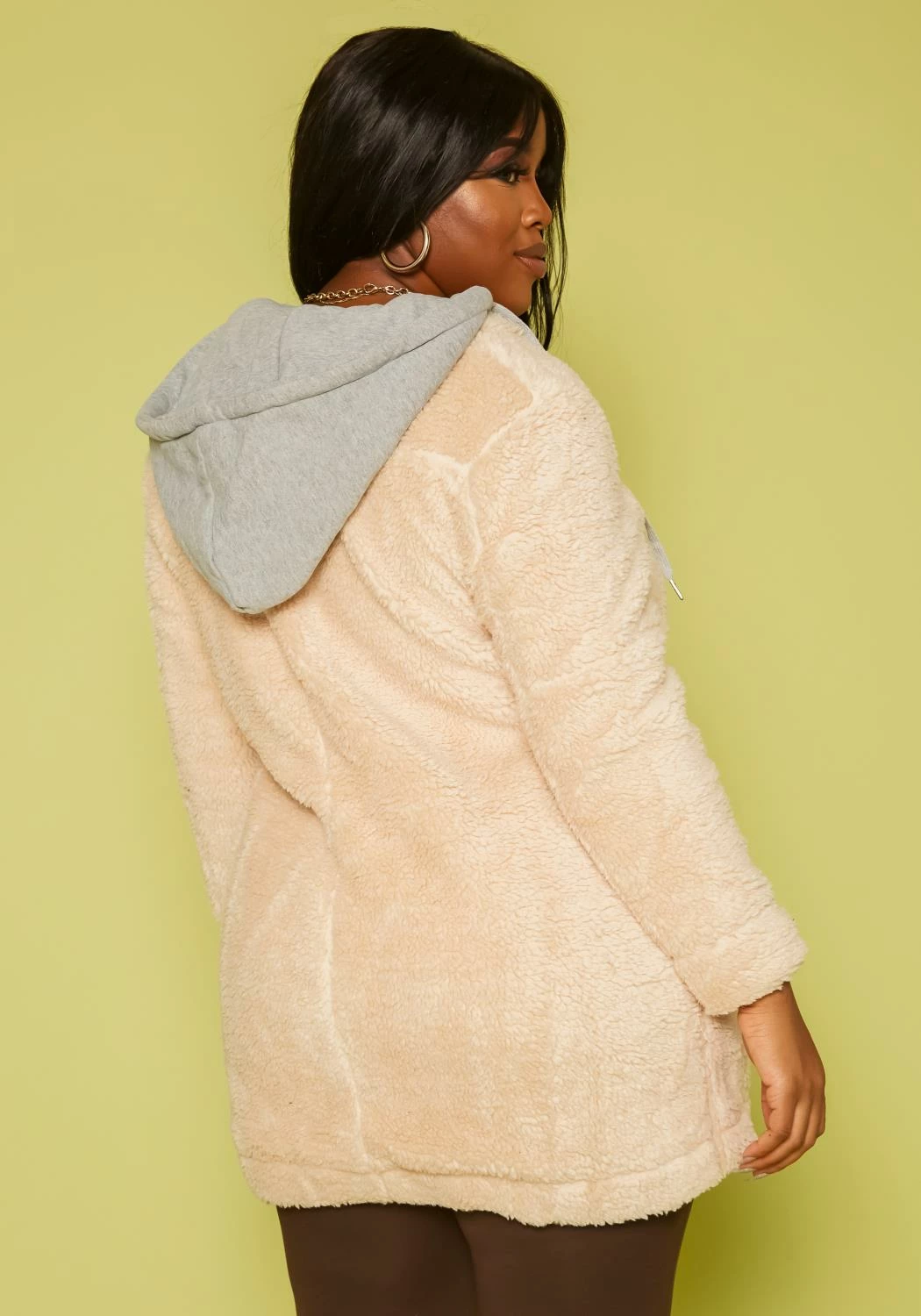 Warm faux fur jacket for plus size women in grey contrast hooded design, button front closure and pocket hem.