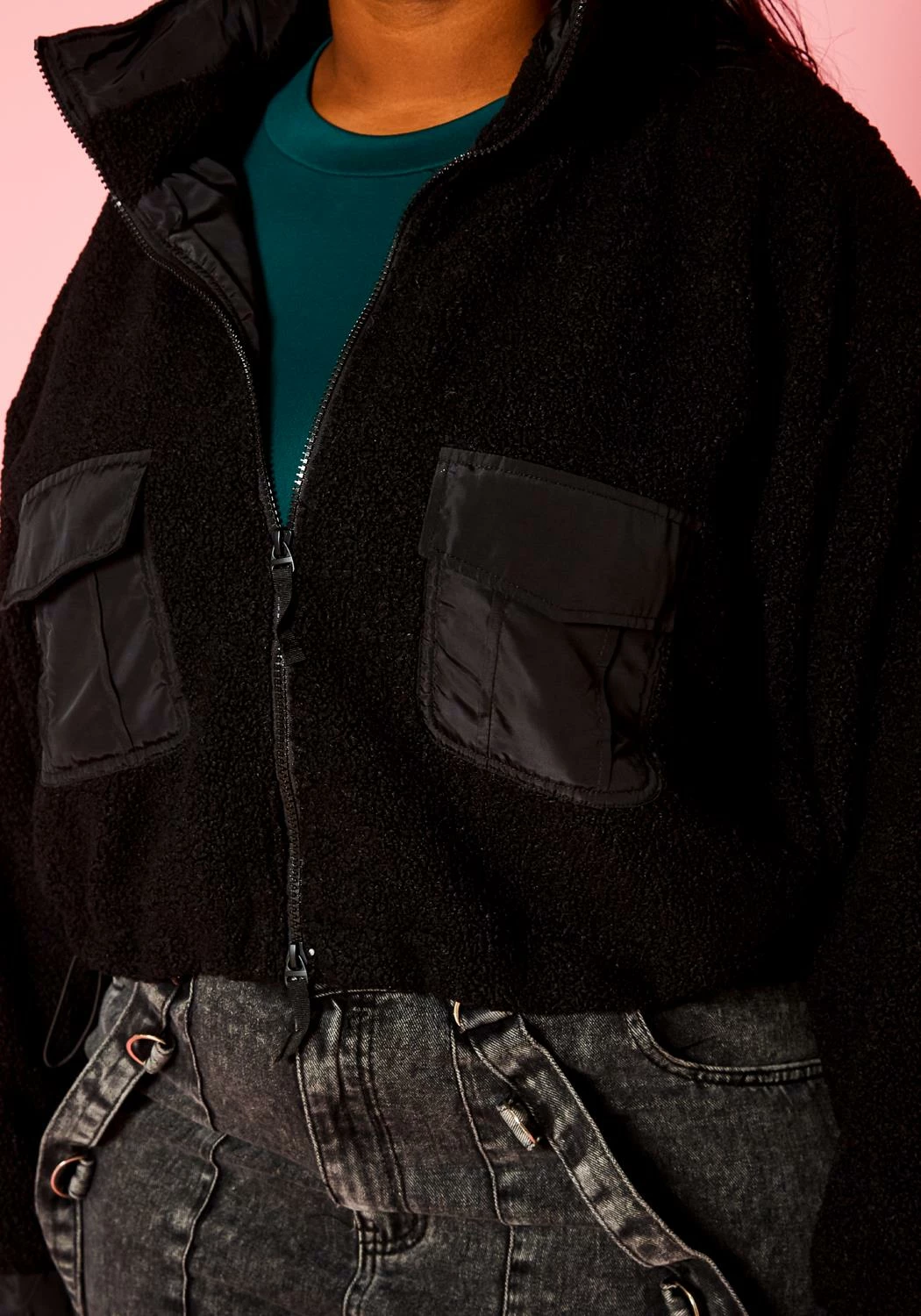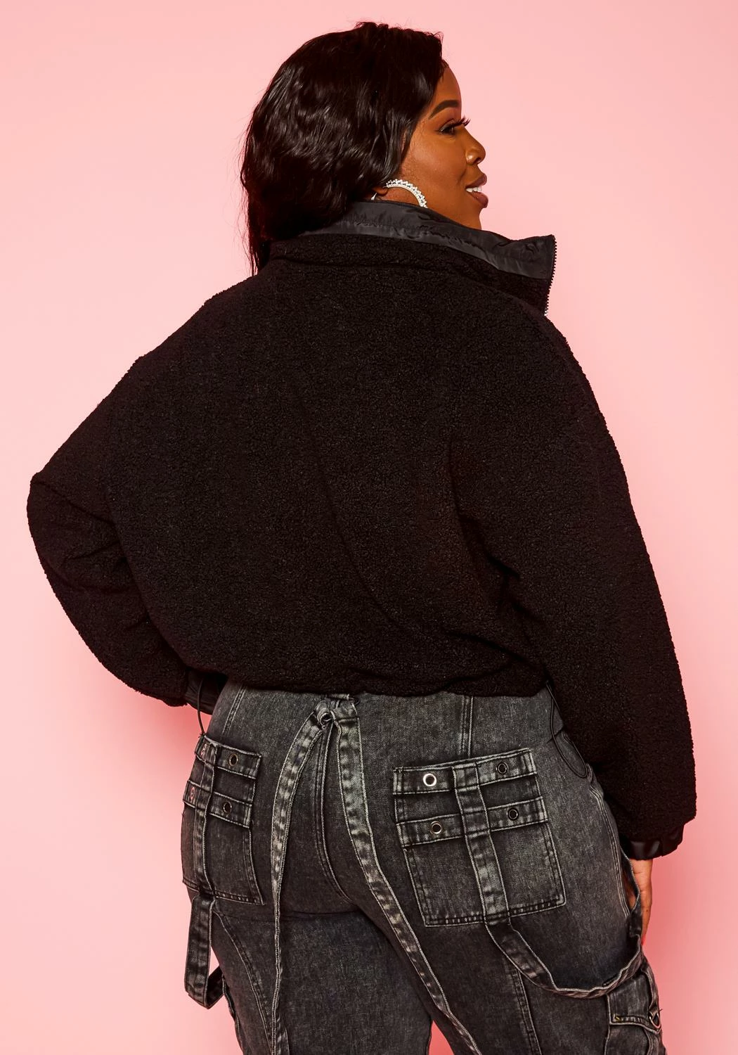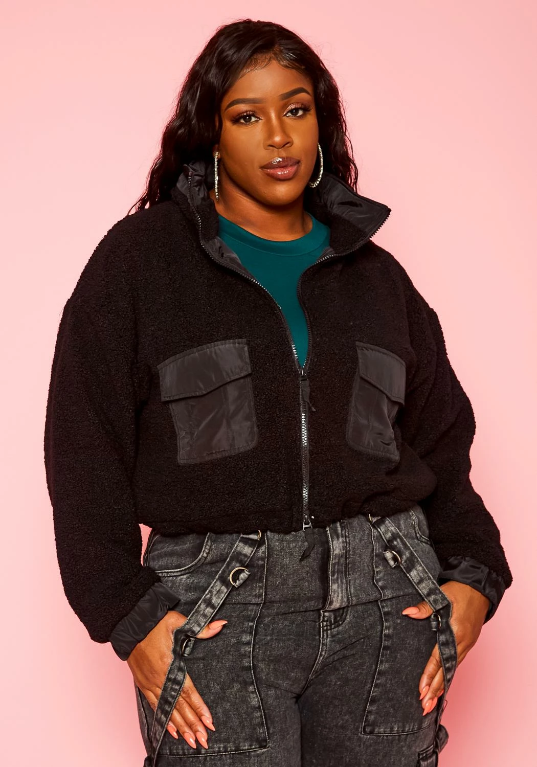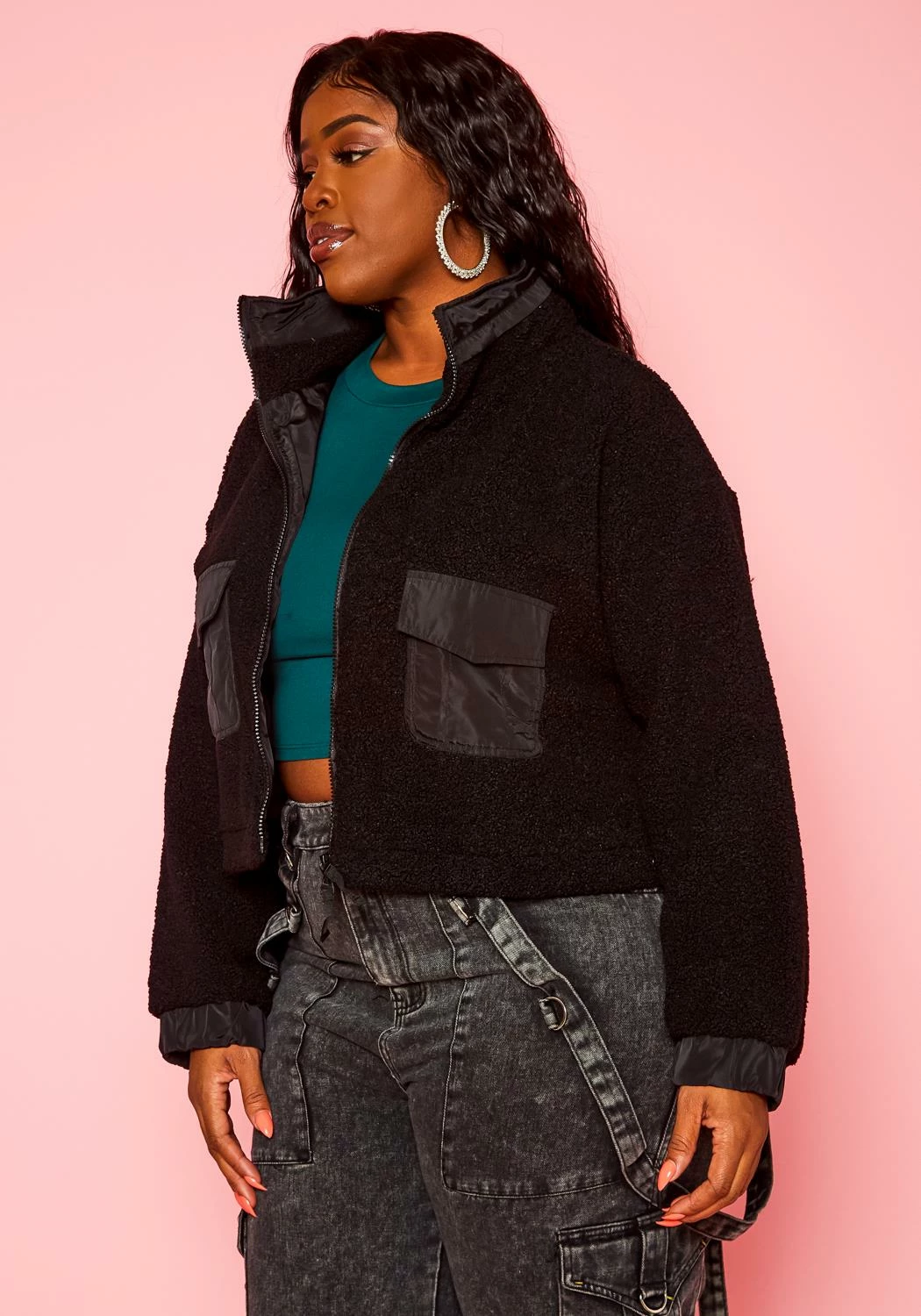 Must have faux fur jacket for plus size women. Features a high neck style, pocket hem, front zipper closure and fitted wrist cuffs.
