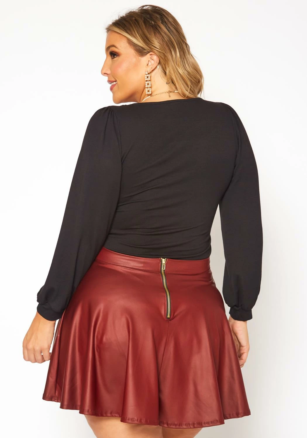 Edgy meets chic in Asoph’s matte faux leather high waist mini circle skirt! A must have plus size women’s skirt that shows off a cute and stylish appeal. Contains back mid zipper closure.