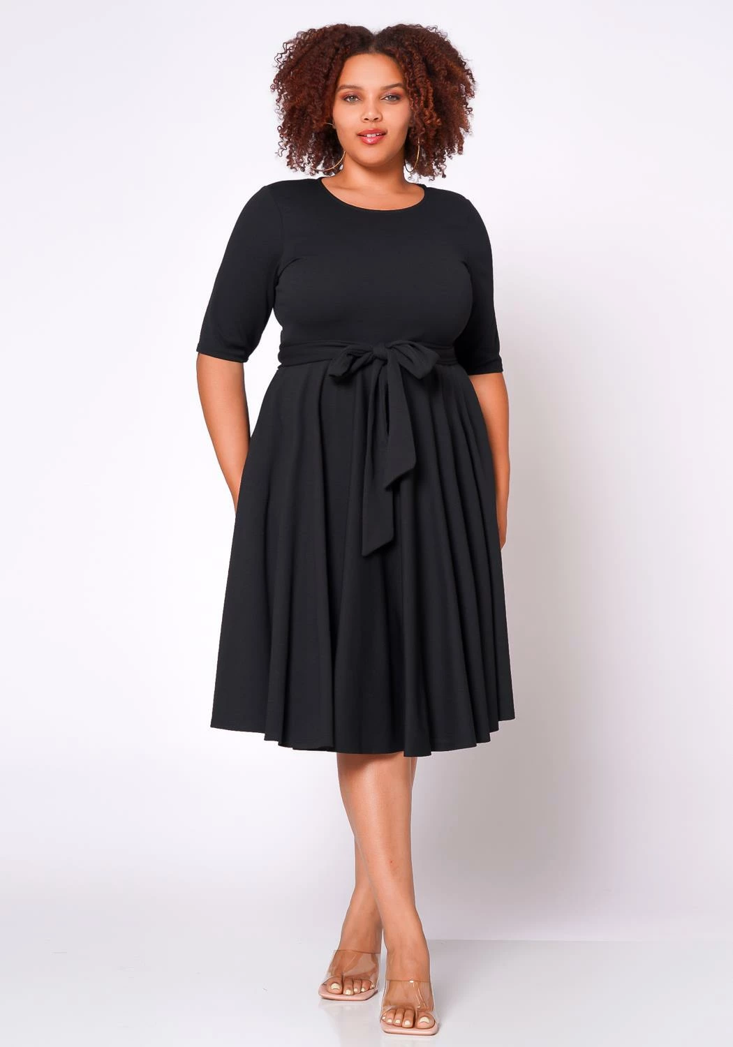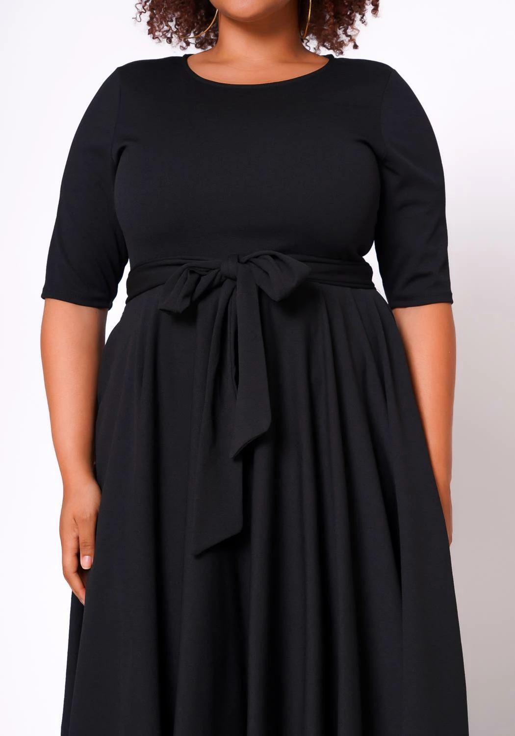 Plus size women’s dress in fit & flare style featuring a round neck hem, attached waist tie ascent, elbow sleeves and side pockets.