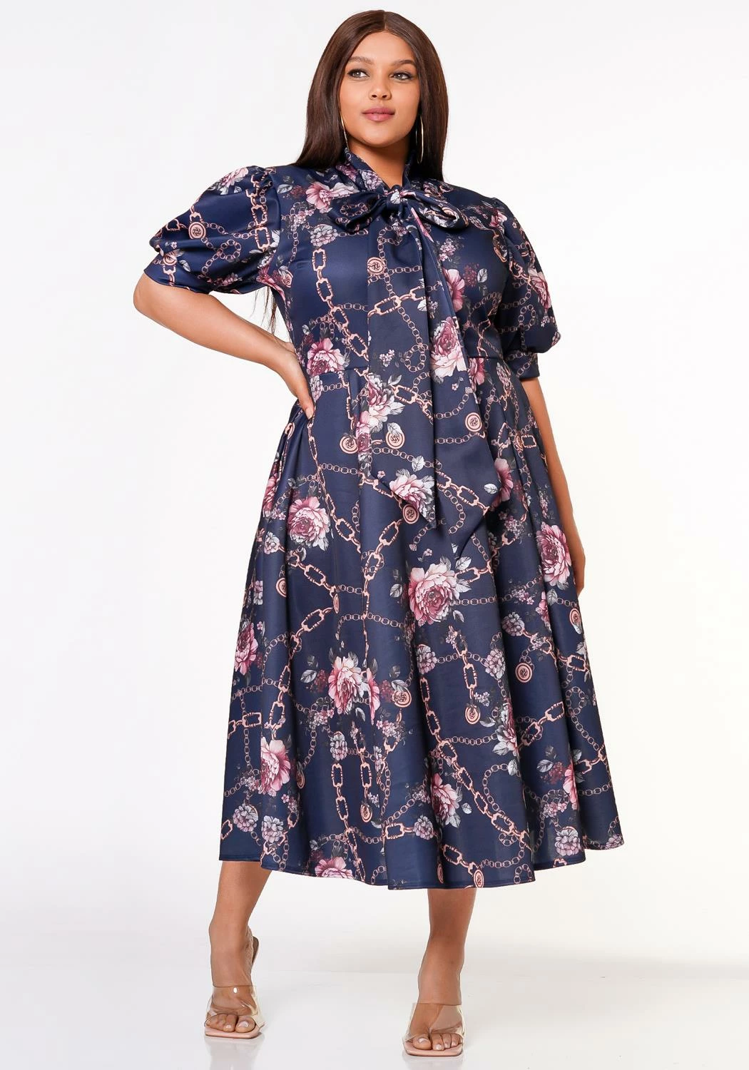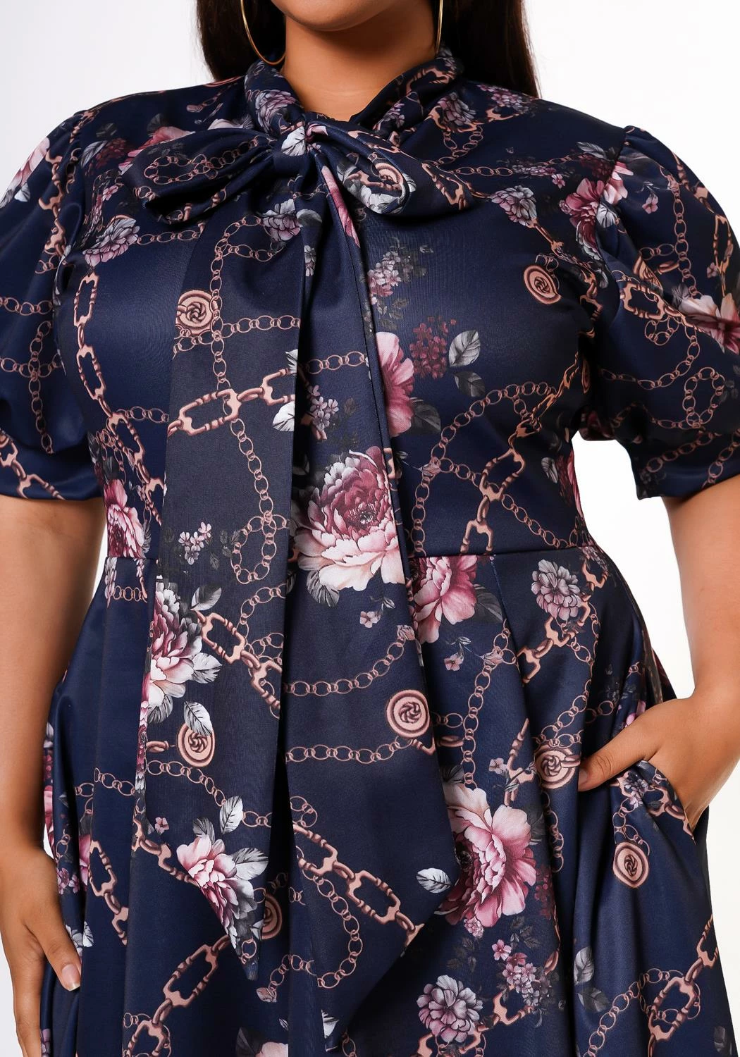Pretty plus size women’s floral chainlink midi dress in fit to flare design, collar bow tie ascent, short puff sleeves and pocket hem.