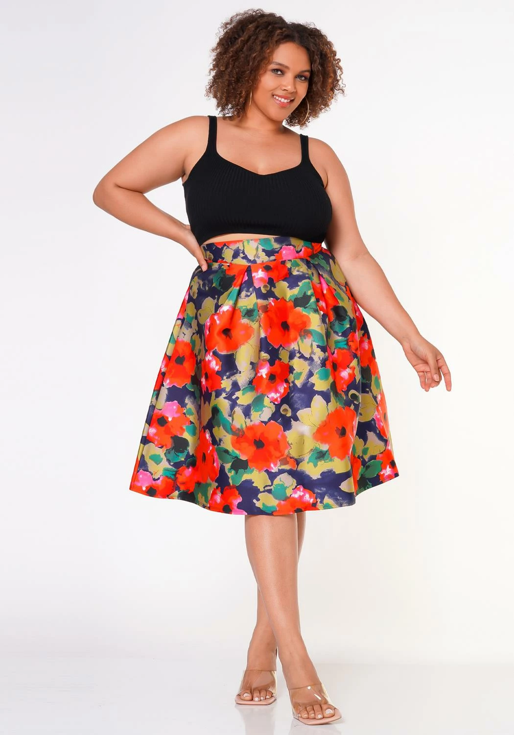 Lovely plus size women’s floral pattern midi skirt in wide flare hem, high waist style and zipper closure.