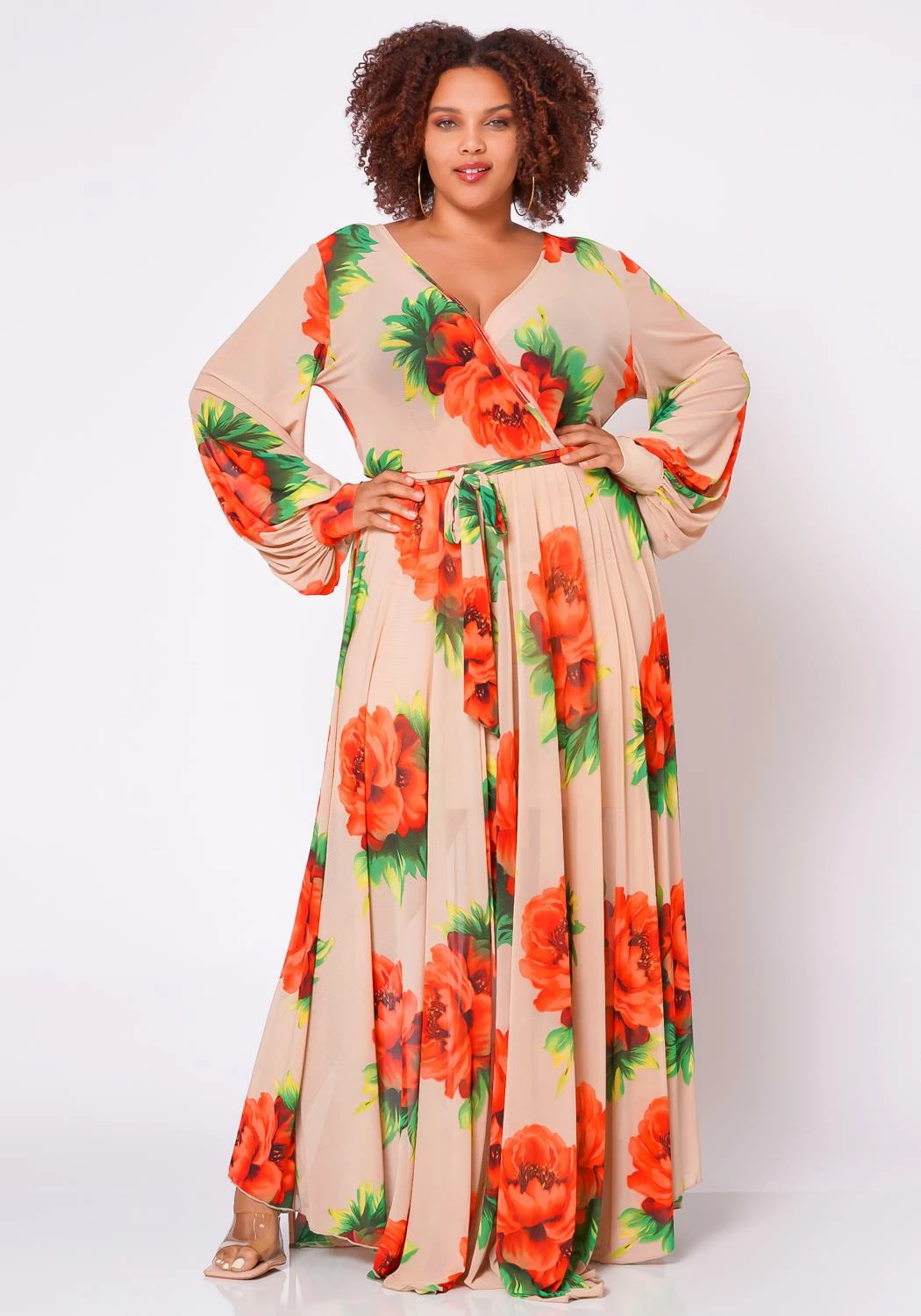 Event outgoing maxi chiffon dress for plus size woman featuring beautiful floral print design, v-neck look with balloon flared sleeves.