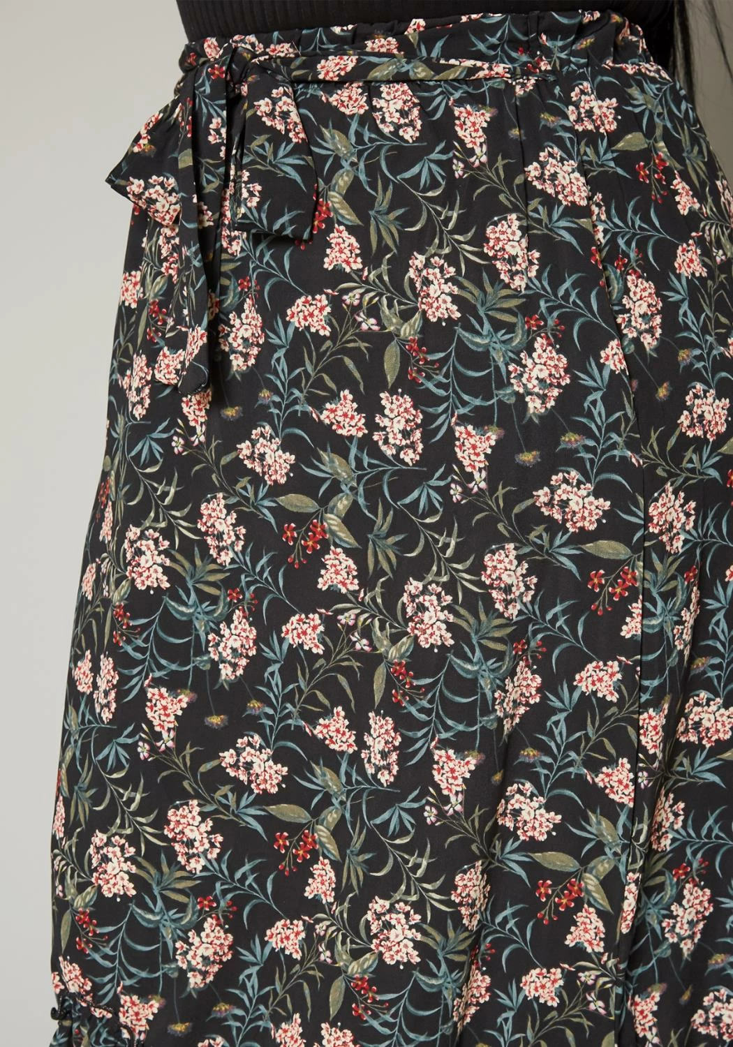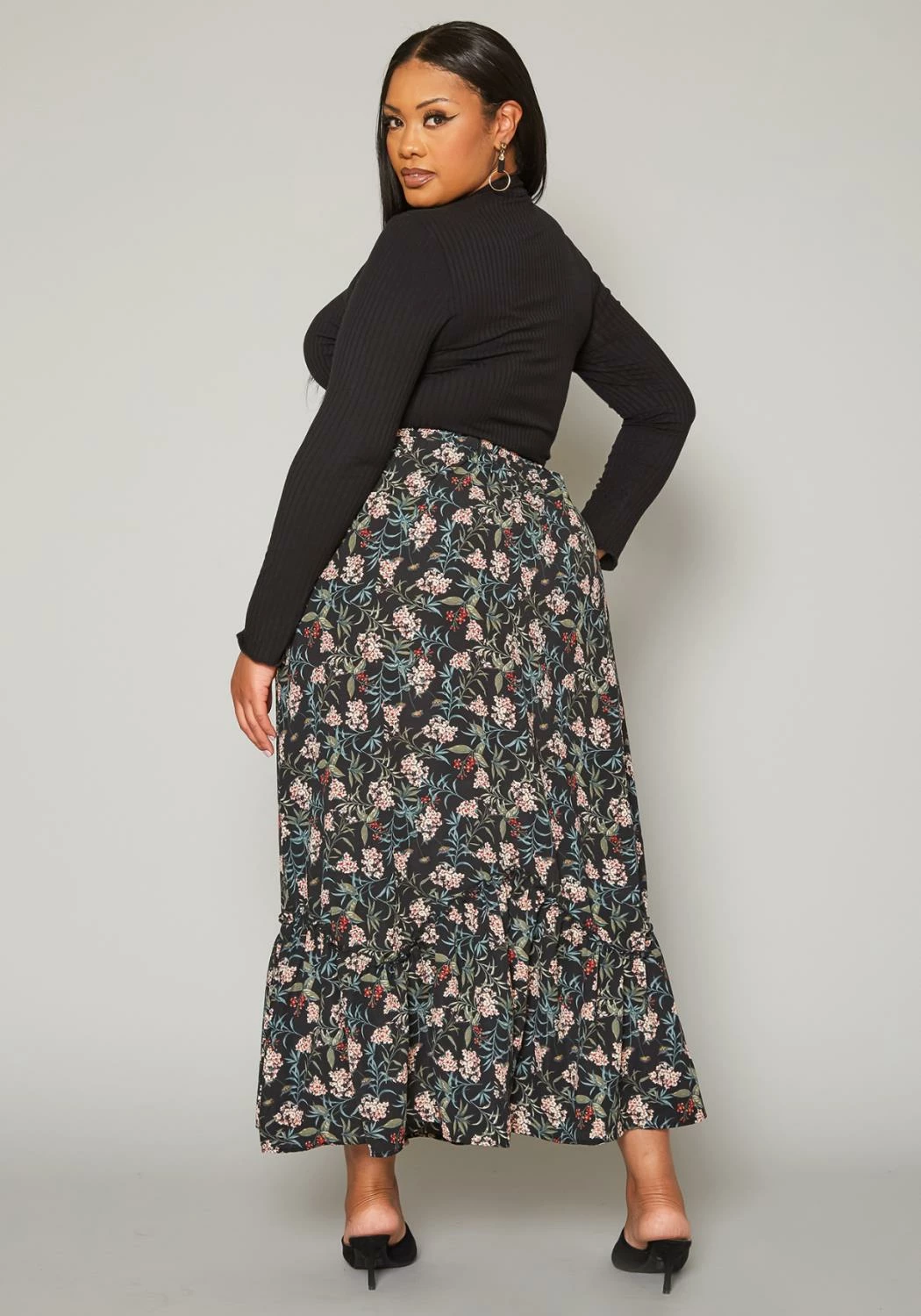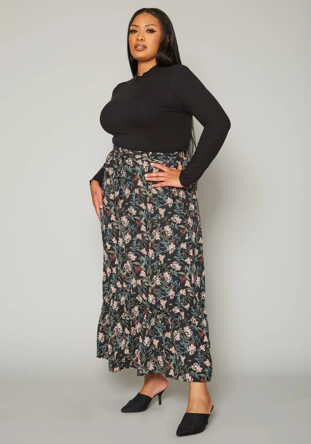 Lovely plus size women’s maxi skirt in floral print, high waist style, waist tie ascent and flare design.