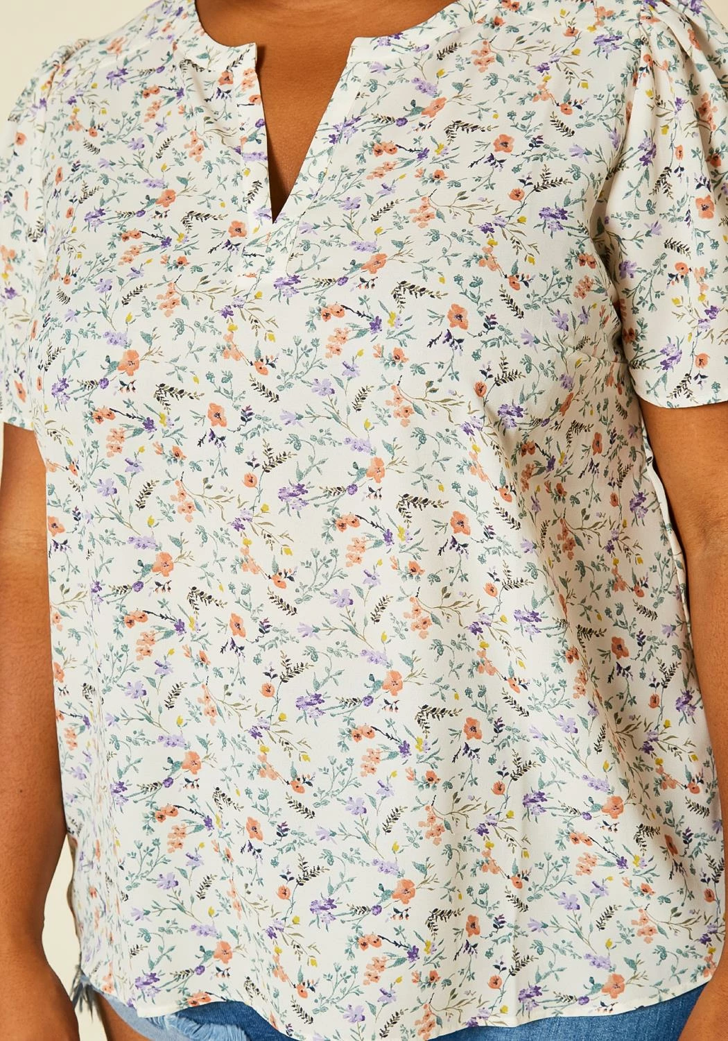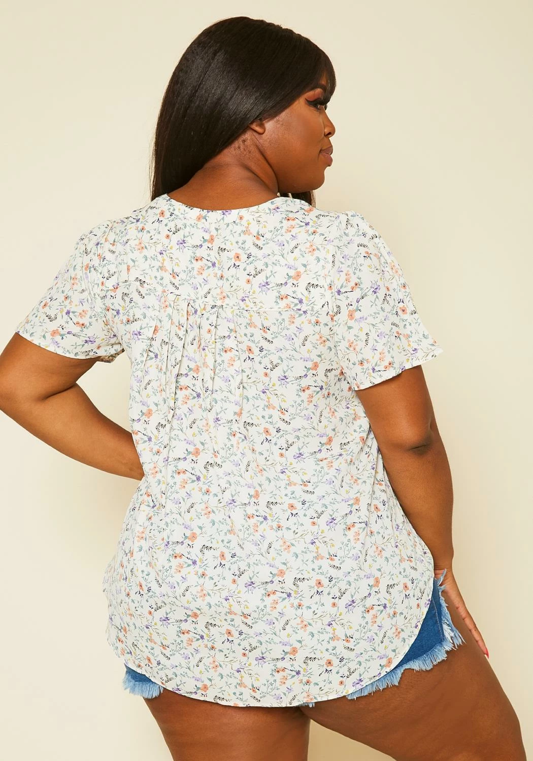 Plus size women’s top featuring floral print, v-neck hem, high low style & flounce short sleeves.
