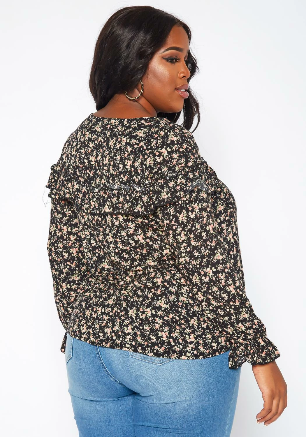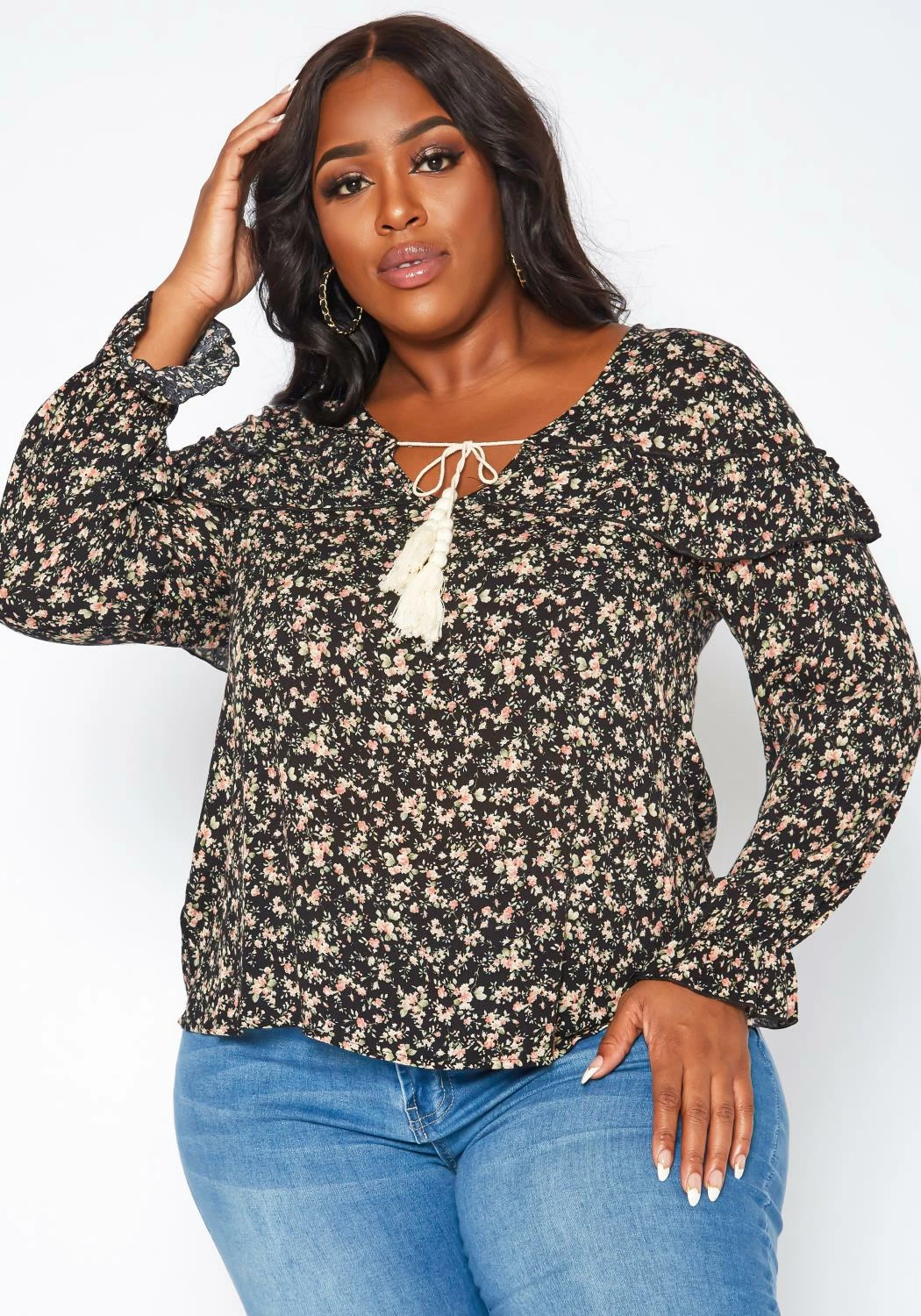Lovely plus size women’s floral pattern top in v-neck style, long sleeves, tie front ascent and ruffle trim.