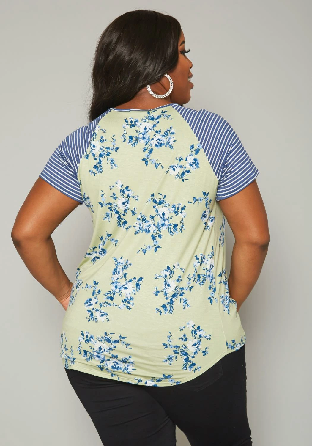 Casual plus size women’s t-shirt in multi striped-floral pattern, short sleeves, twist hem detail and relaxed fitting.