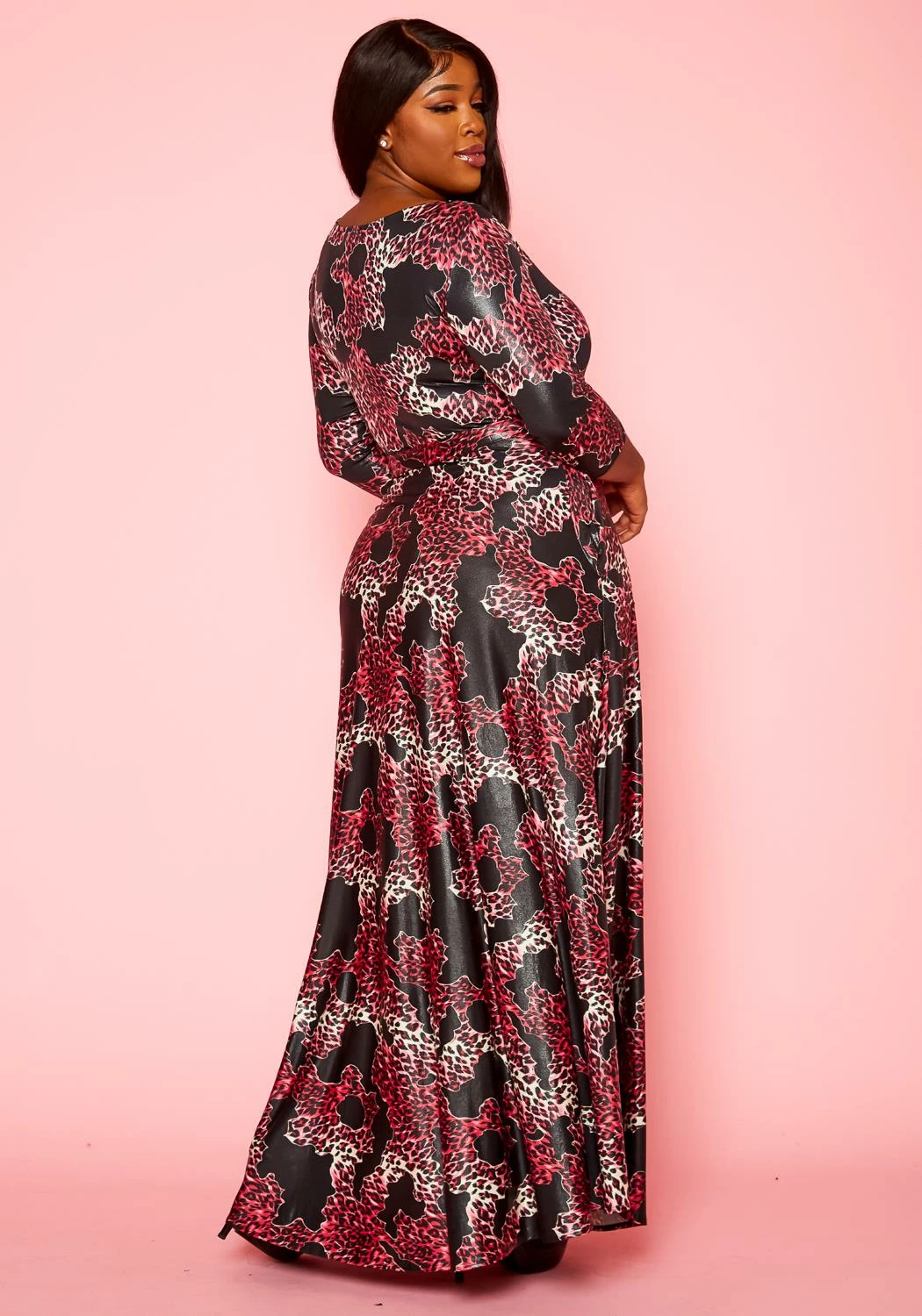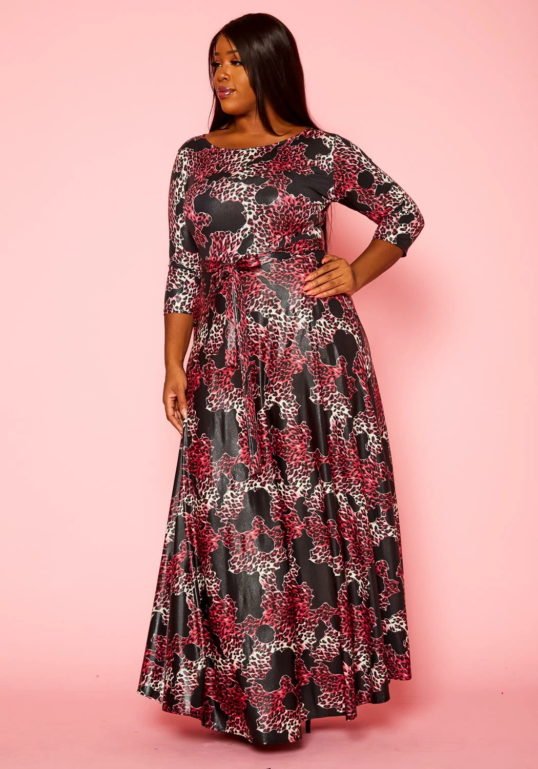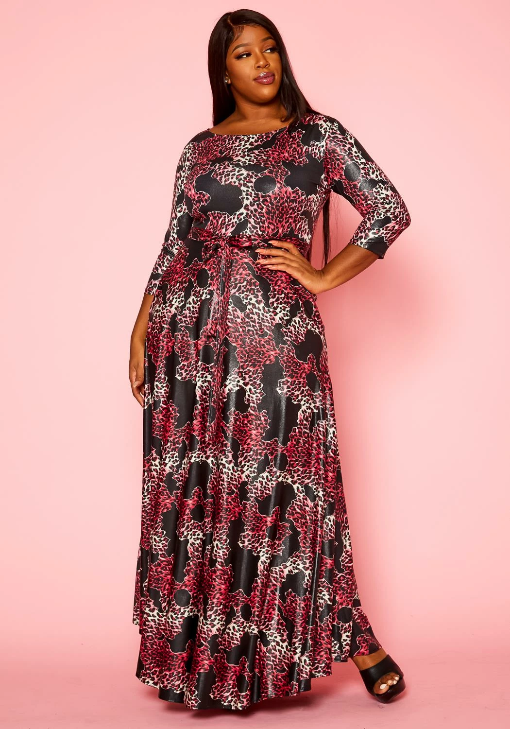 Plus size women’s fuchsia leopard pattern fit to flare maxi dress with waist tie ascent and 3/4 long sleeves.