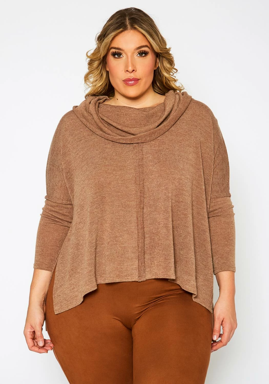 Plus size women’s sweater top in knit material, funnel neck style, fitted long sleeves and relaxed hem.